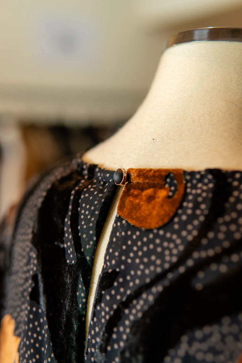 Com fundo preto pontilhado em microestampa e sobreposições de veludo devoré floral, o vestido exala profundidade visual e uma presença tátil marcante. As mangas fluidas e o caimento estratégico realçam o movimento do corpo com sofisticação silenciosa.