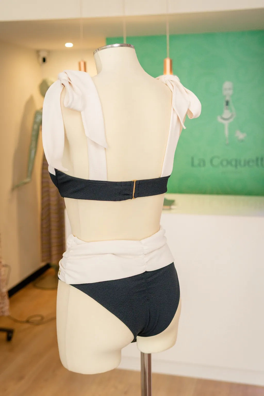 A parte inferior, em tonalidade escura contrastante, assume um corte clássico de cintura média, realçada por uma faixa em tecido claro que cruza elegantemente a zona abdominal. Esta sobreposição, para além de conferir um efeito de cintura cintada, traduz-se num detalhe estético que acentua a fluidez e o movimento do conjunto. O acabamento é complementado por uma discreta medalha metálica dourada, que reforça a identidade da marca com discrição e bom gosto.