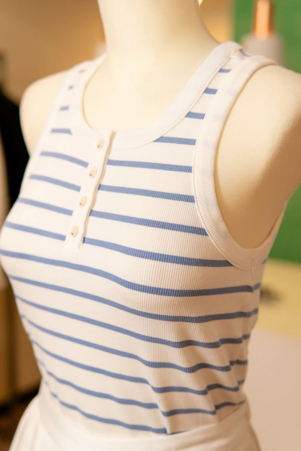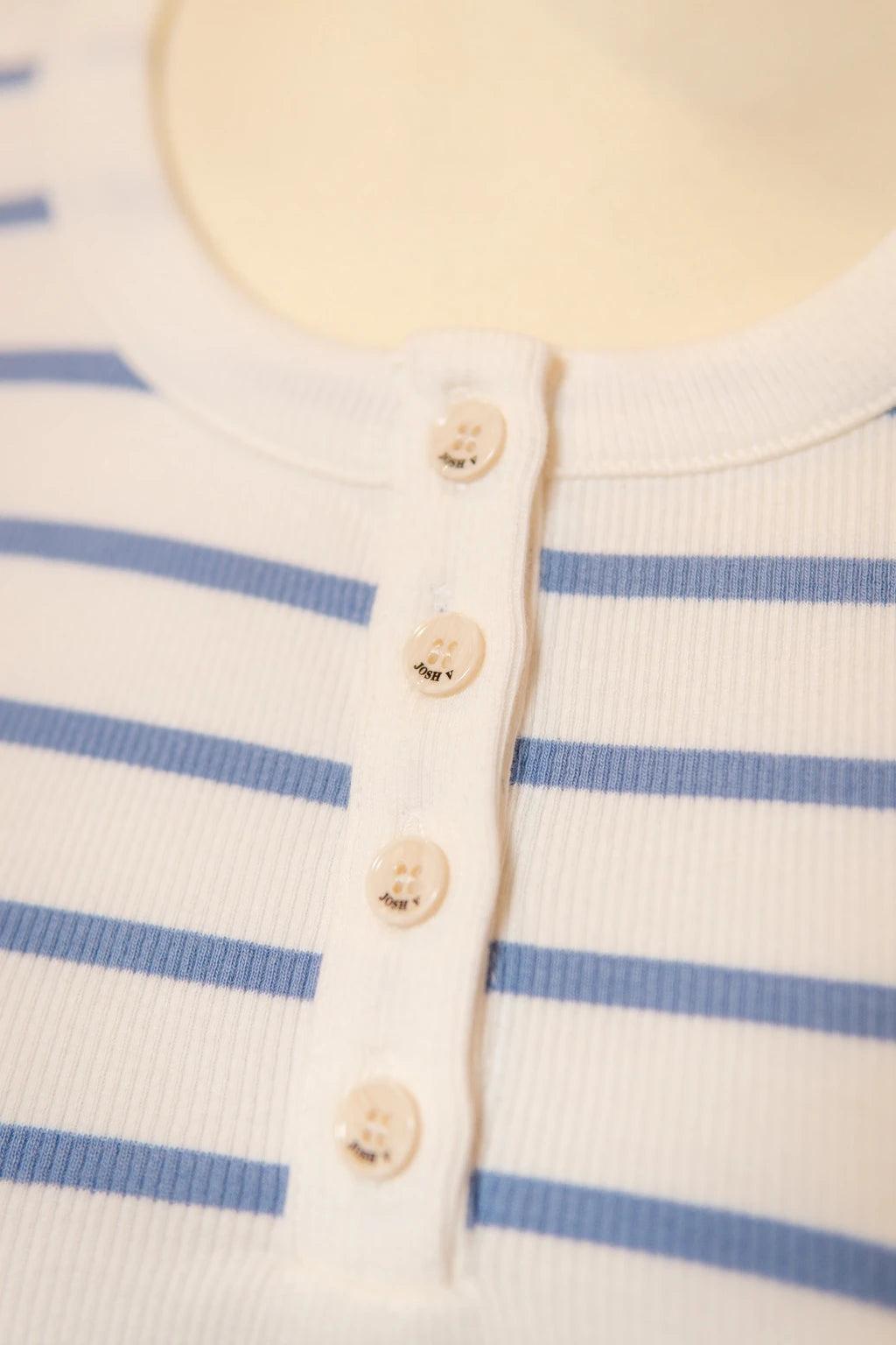 A peça apresenta-se como um tributo à estética marítima, onde a harmonia entre o branco puro e as subtis riscas em azul celeste evoca a serenidade das manhãs costeiras. O corte impecável e o tecido de malha canelada moldam-se ao corpo com naturalidade, proporcionando um caimento que une conforto e distinção. Cada botão, delicadamente posicionado, não se limita a um mero fecho funcional, mas antes se impõe como um detalhe ornamental de apuro técnico.
