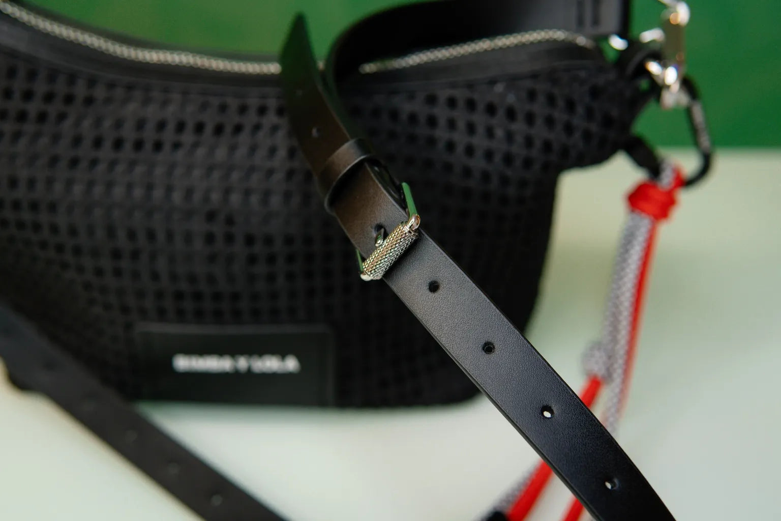 A bolsa apresenta-se como uma obra de sobriedade refinada, em que o couro negro, de textura subtilmente rugosa, revela uma profundidade quase escultórica. A sua forma compacta, delineada por proporções equilibradas, resulta num acessório que transcende a utilidade e se afirma como símbolo de elegância discreta.