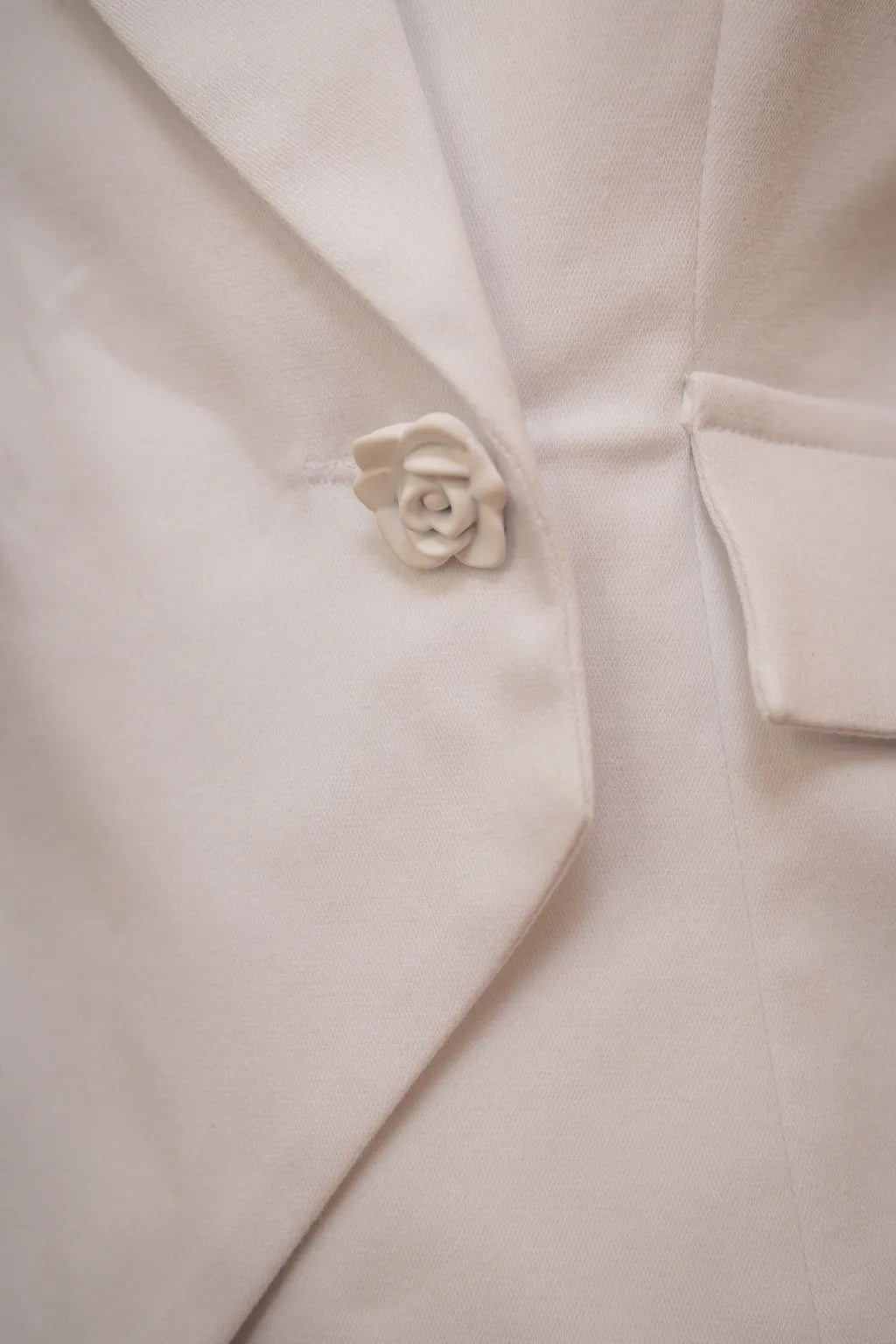 Este conjunto integralmente branco, composto por blazer estruturado e calças de corte clássico, destaca-se pela sua sofisticação limpa e linguagem estética refinada. O blazer, de silhueta cintada e lapela ampla, ostenta com subtil ousadia dois botões em formato de flor, meticulosamente aplicados, que conferem um toque singular de elegância escultórica à peça.