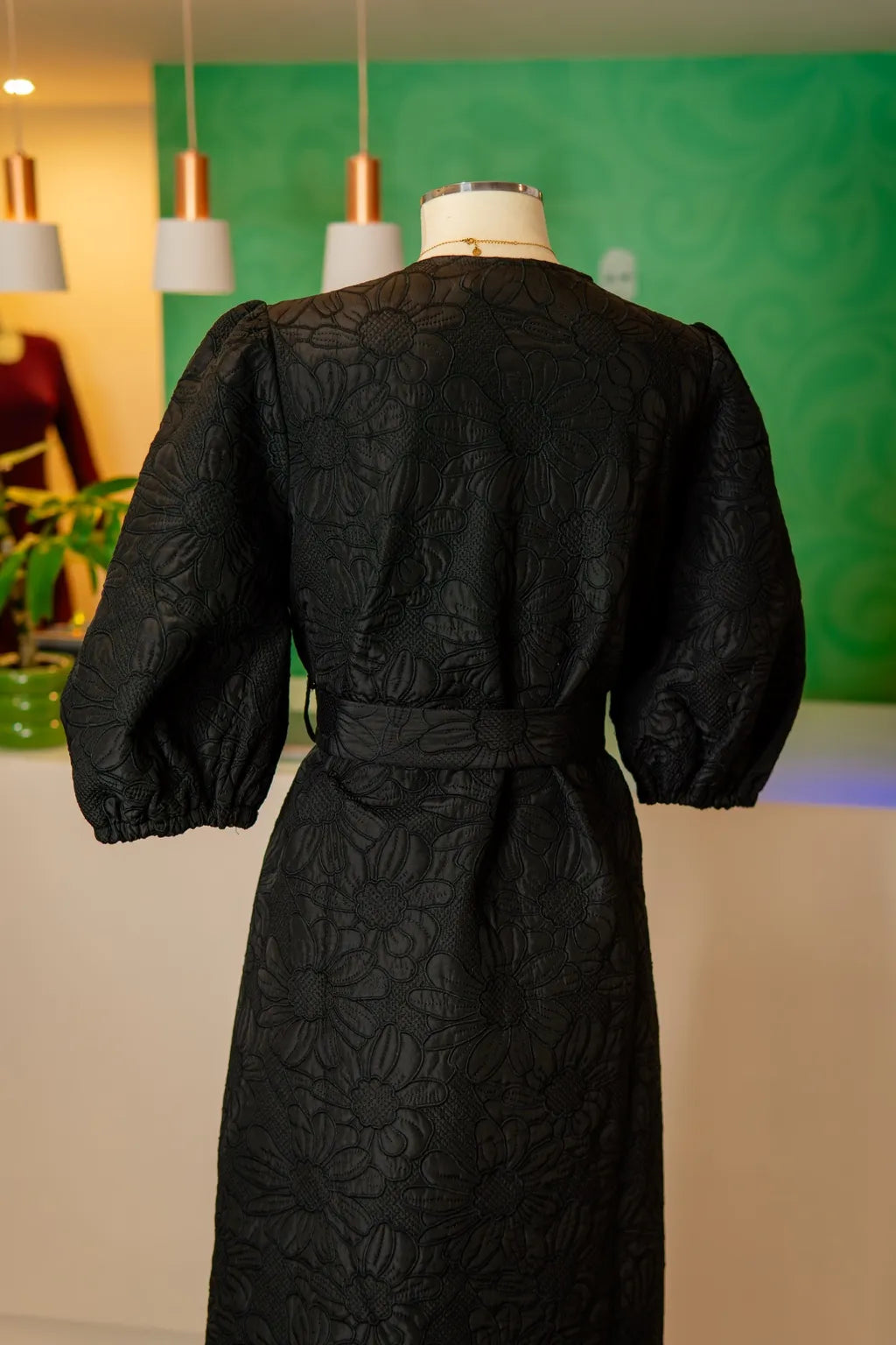 Modelagem transpassada com decote em “V” profundo, marcada pela cintura ajustável com faixa forrada. O jacquard floral em alto-relevo transforma o preto em tridimensionalidade pura e presença tática.