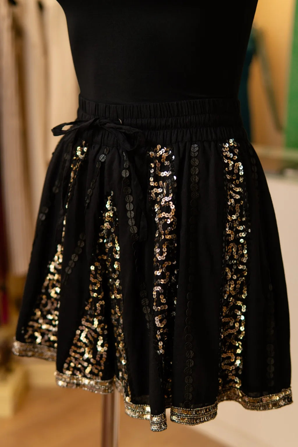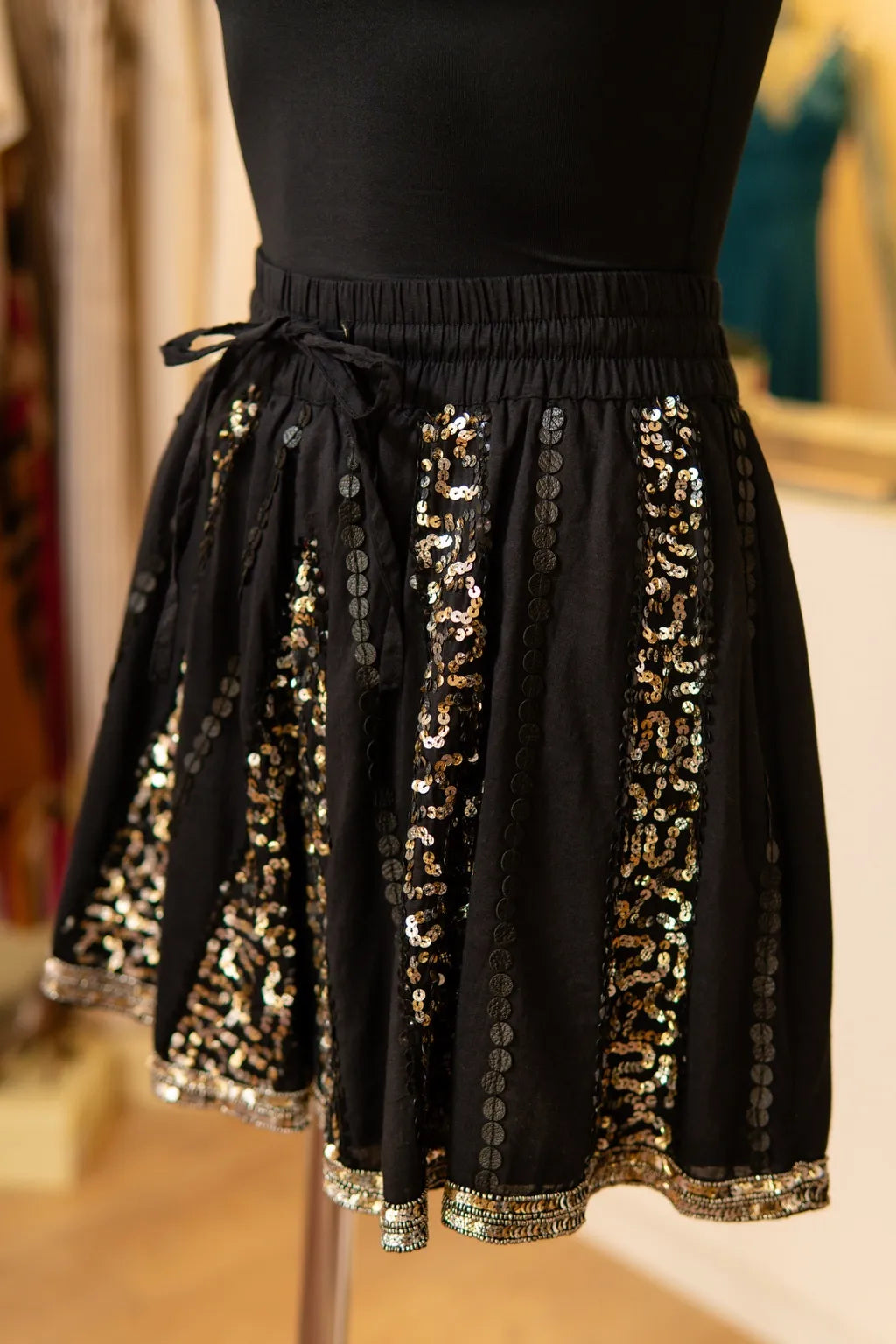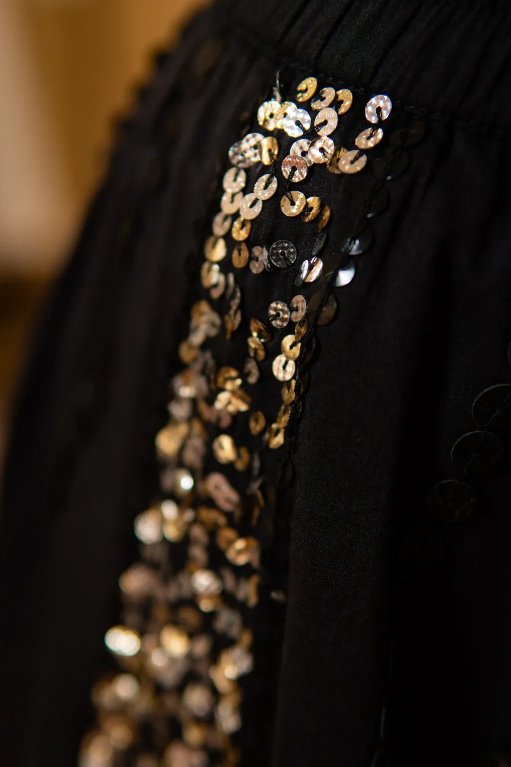 Em cada detalhe desta saia, manifesta-se a fusão perfeita entre sofisticação e ousadia. Confeccionado em tecido negro de base suave, é enriquecido por uma profusão de lantejoulas douradas que cintilam a cada movimento, criando um jogo de luzes tão magnético quanto intemporal. O caimento fluido, levemente estruturado na cintura por um laço discreto, traduz a harmonia entre conforto e requinte.