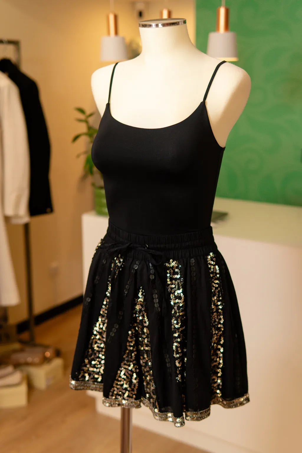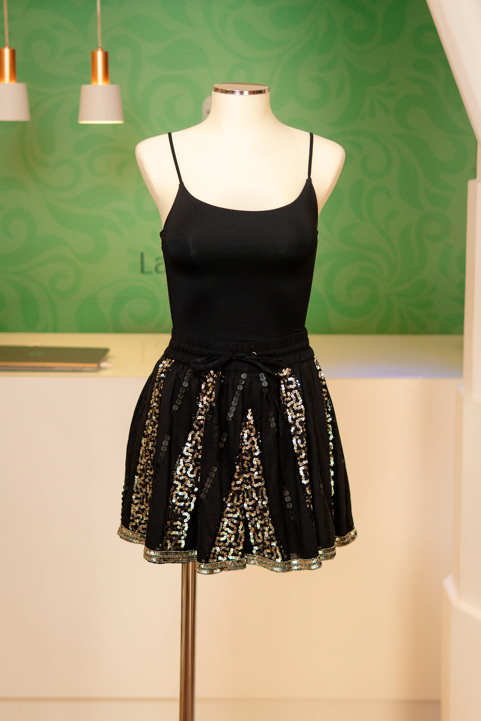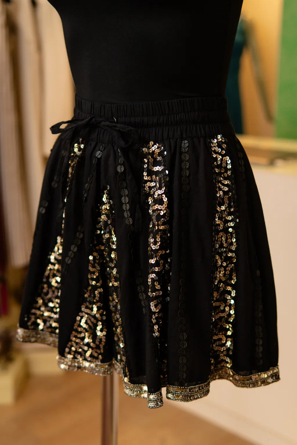Em cada detalhe desta saia, manifesta-se a fusão perfeita entre sofisticação e ousadia. Confeccionado em tecido negro de base suave, é enriquecido por uma profusão de lantejoulas douradas que cintilam a cada movimento, criando um jogo de luzes tão magnético quanto intemporal. O caimento fluido, levemente estruturado na cintura por um laço discreto, traduz a harmonia entre conforto e requinte.