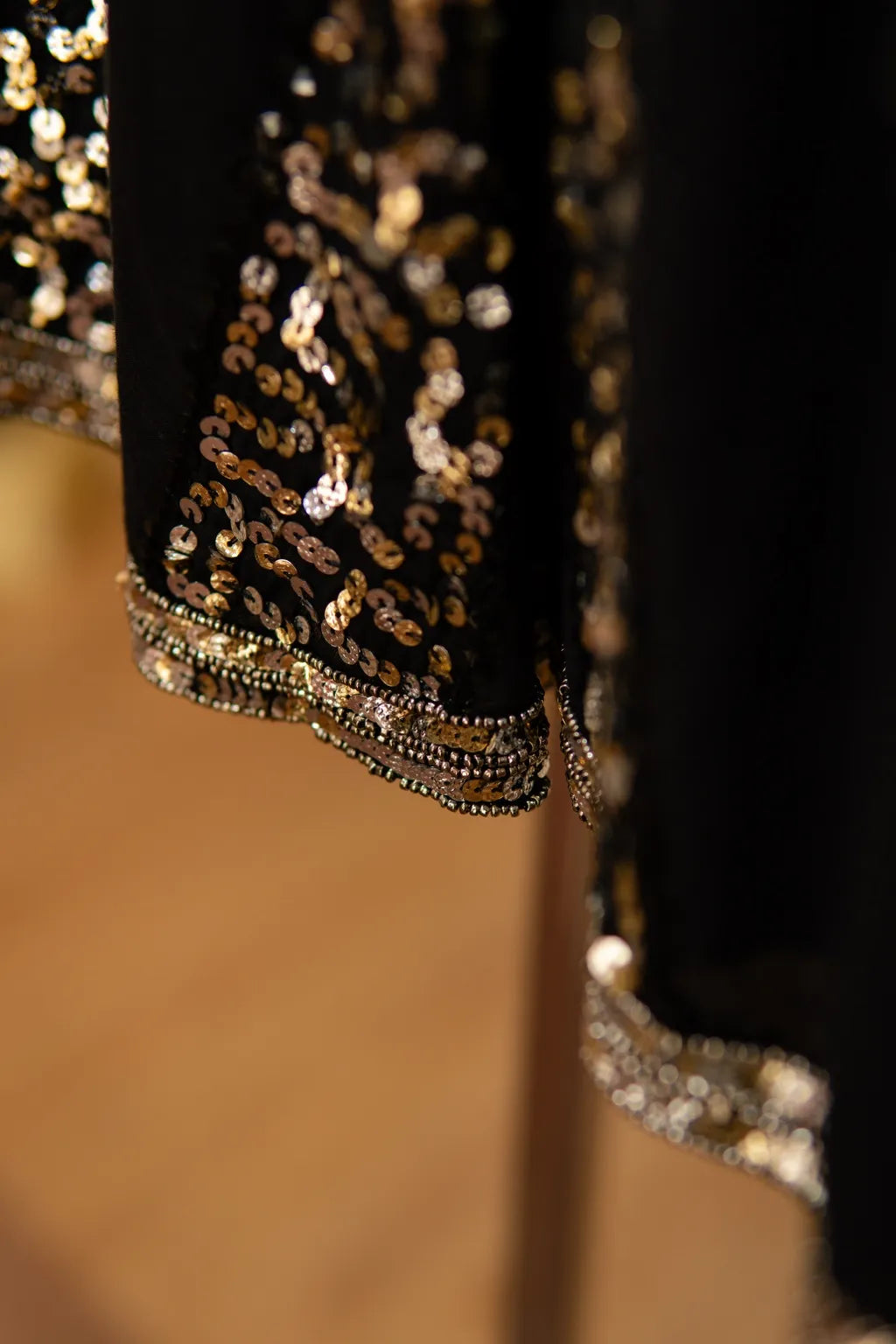 É uma peça concebida para transcender graças, elevando qualquer composição a um patamar de distinção. O contraste entre a intensidade do negro e o esplendor metálico das lantejoulas confere-lhe um caráter imponente, destinado à mulher que não se limita a seguir tendências, mas se define com a sua presença. Uma expressão de luxo silenciosa, mas absolutamente irresistível.