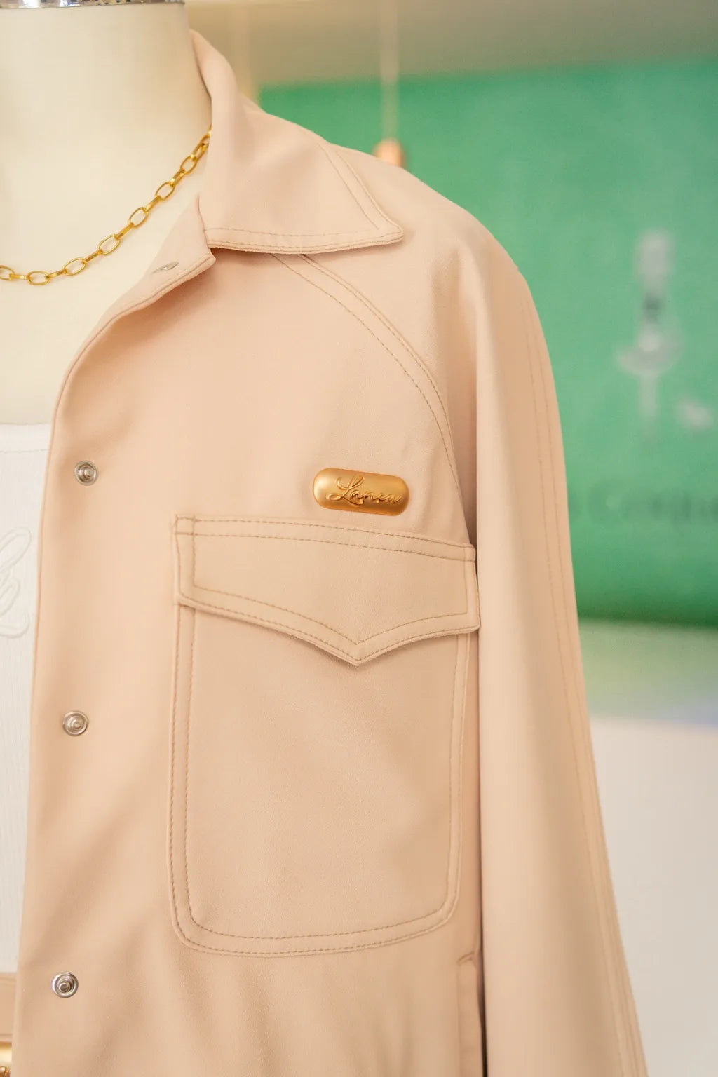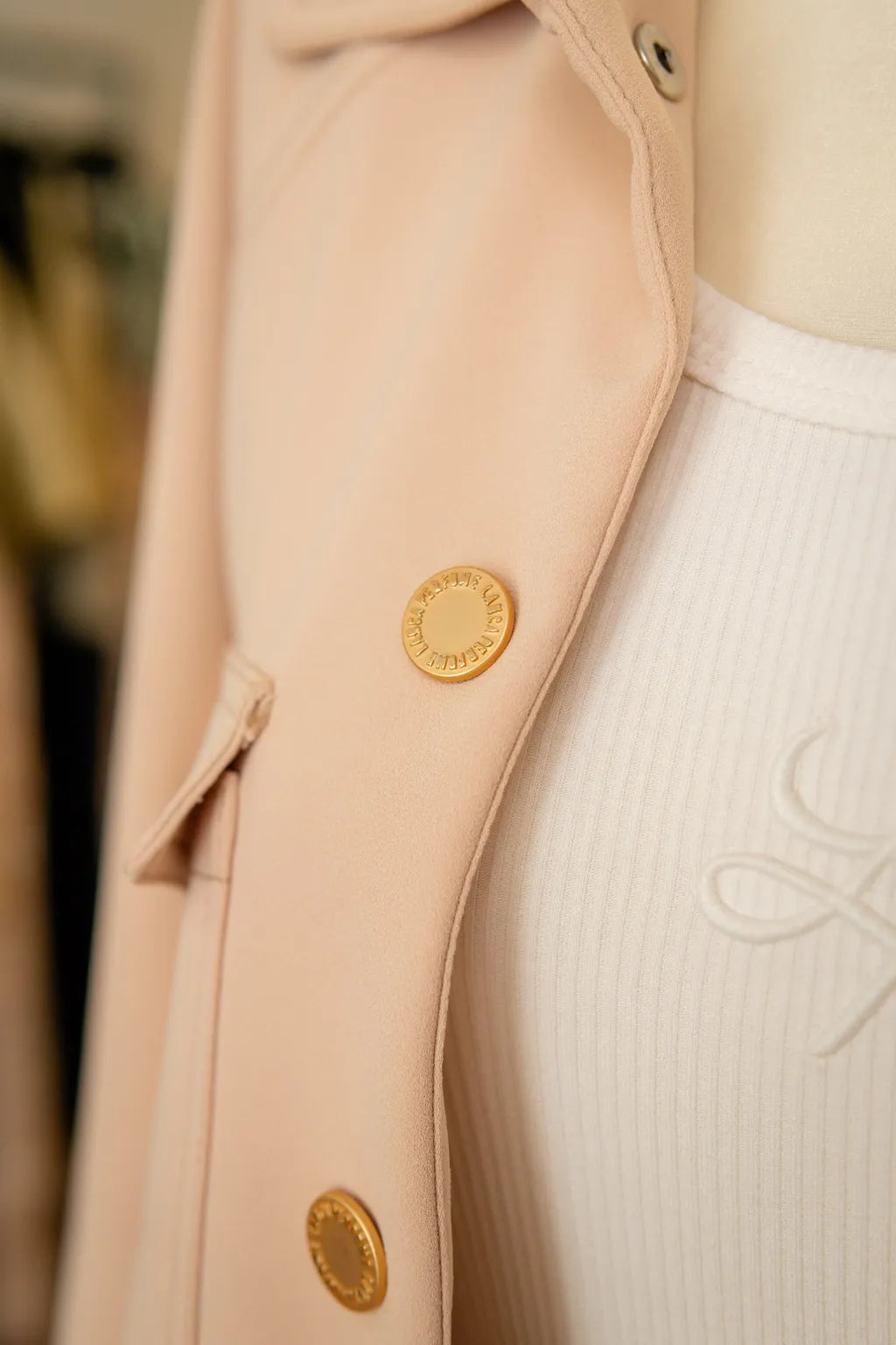 Os botões metálicos dourados, personalizados com gravação da marca, específicos, um ponto de distinção e requinte, elevando o bomber a um patamar de sofisticação discreta. O acabamento elástico na base e nos punhos traduz uma abordagem contemporânea à alfaiataria tradicional, introduzindo elementos de design que aliam conforto ergonômico e modernidade visual.