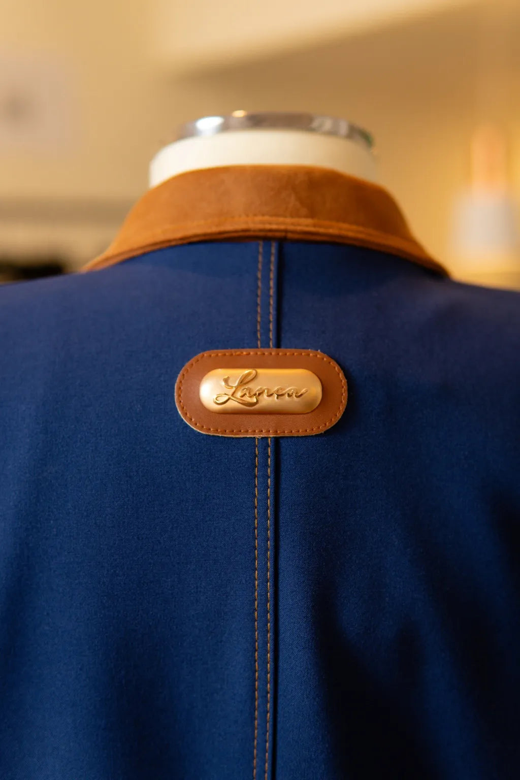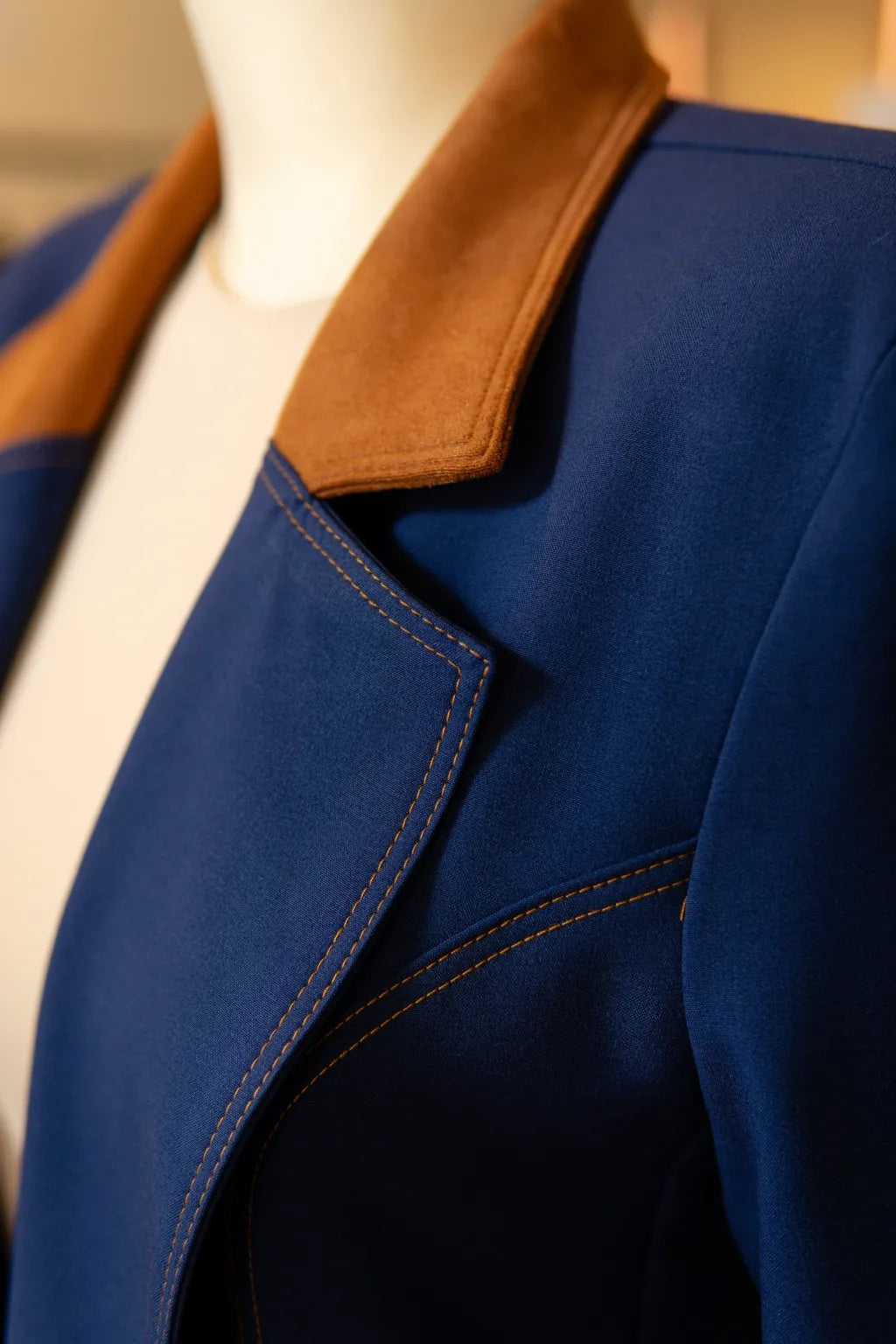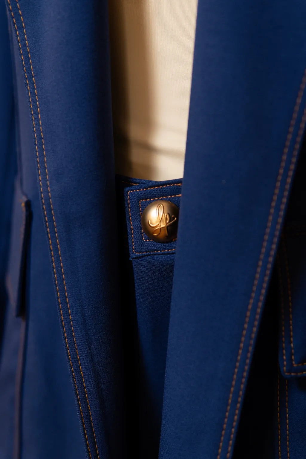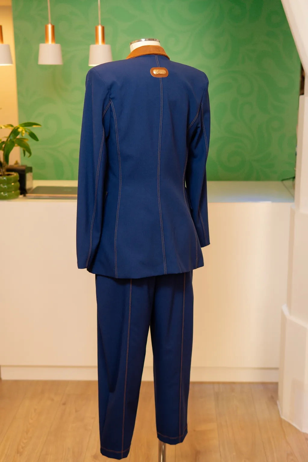Confecionado com meticulosa atenção ao detalhe, este conjunto em azul profundo revela-se uma ode à sofisticação intemporal. O casaco, de linhas firmes e estrutura impecável, ostenta uma gola em tom camel que introduz um contraste subtil e requintado, conferindo-lhe um carácter distinto e exclusivo. A costura meticulosamente delineada evidencia não apenas o rigor do corte, mas também a qualidade intrínseca de cada ponto, resultando numa peça que transcende modas passageiras.