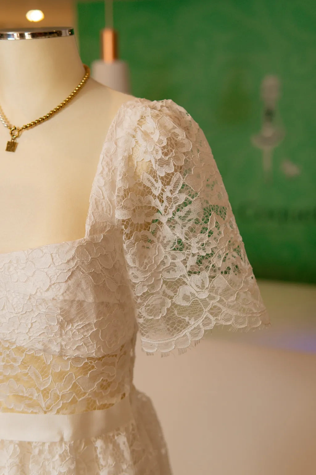 A pureza da renda delicadamente trabalhada encontra-se, nesta peça, com a subtileza de um design que privilegia a harmonia das formas e a sofisticação dos detalhes. A tonalidade marfim, de suavidade etérea, é magistralmente realçada pelo intrincado rendilhado floral, que recobre toda a superfície, conferindo-lhe uma textura visual e táctil de requinte absoluto. A cintura marcada, suavemente delineada por uma faixa lisa, cria uma silhueta graciosa que evoca a tradição da alta-costura, mantendo, contudo, uma modernidade discreta e intemporal.
