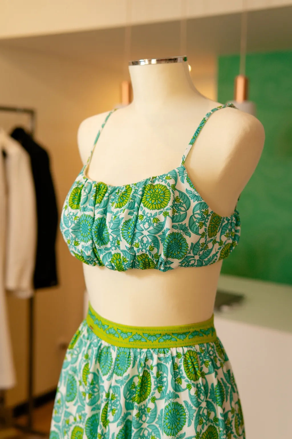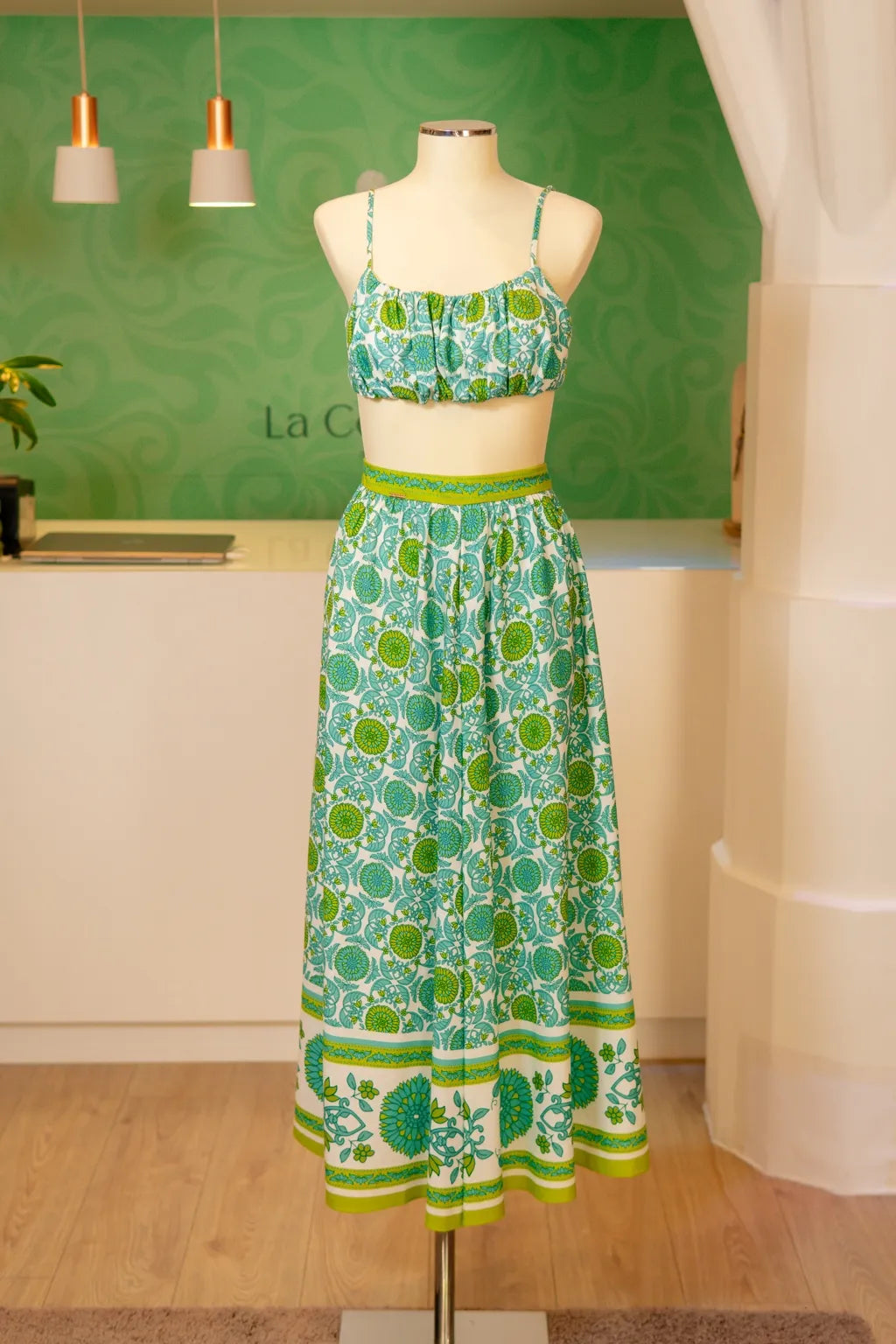 Inspirado na harmonia da natureza, este conjunto distingue-se pela meticulosa fusão entre frescura visual e sofisticação estética. A delicada estampa floral, em tons vibrantes de verde e azul, revela uma narrativa visual rica em detalhes, evocando a serenidade dos jardins mediterrânicos. O corte milimetricamente estudado garante fluidez e conforto, enquanto o equilíbrio cromático projeta uma presença visual inconfundível.