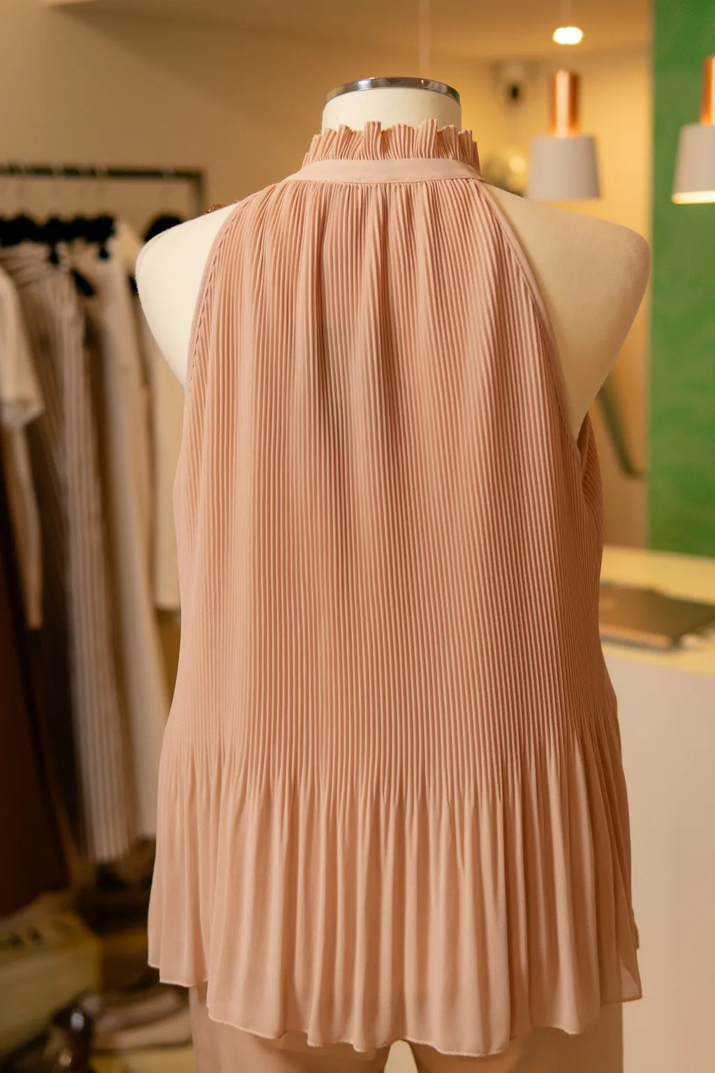 Este delicado top, concebido num tom suave de nude rosado, apresenta uma execução primorosa de pregas finamente plissadas, que fluem harmoniosamente desde o colo até à bainha. A gola alta, rematada por um subtil folho, confere-lhe um carácter sofisticado, enquanto o detalhe ornamental em plissado contrastante, colocado sobre o ombro, acrescenta profundidade estética e um toque artístico incomum.