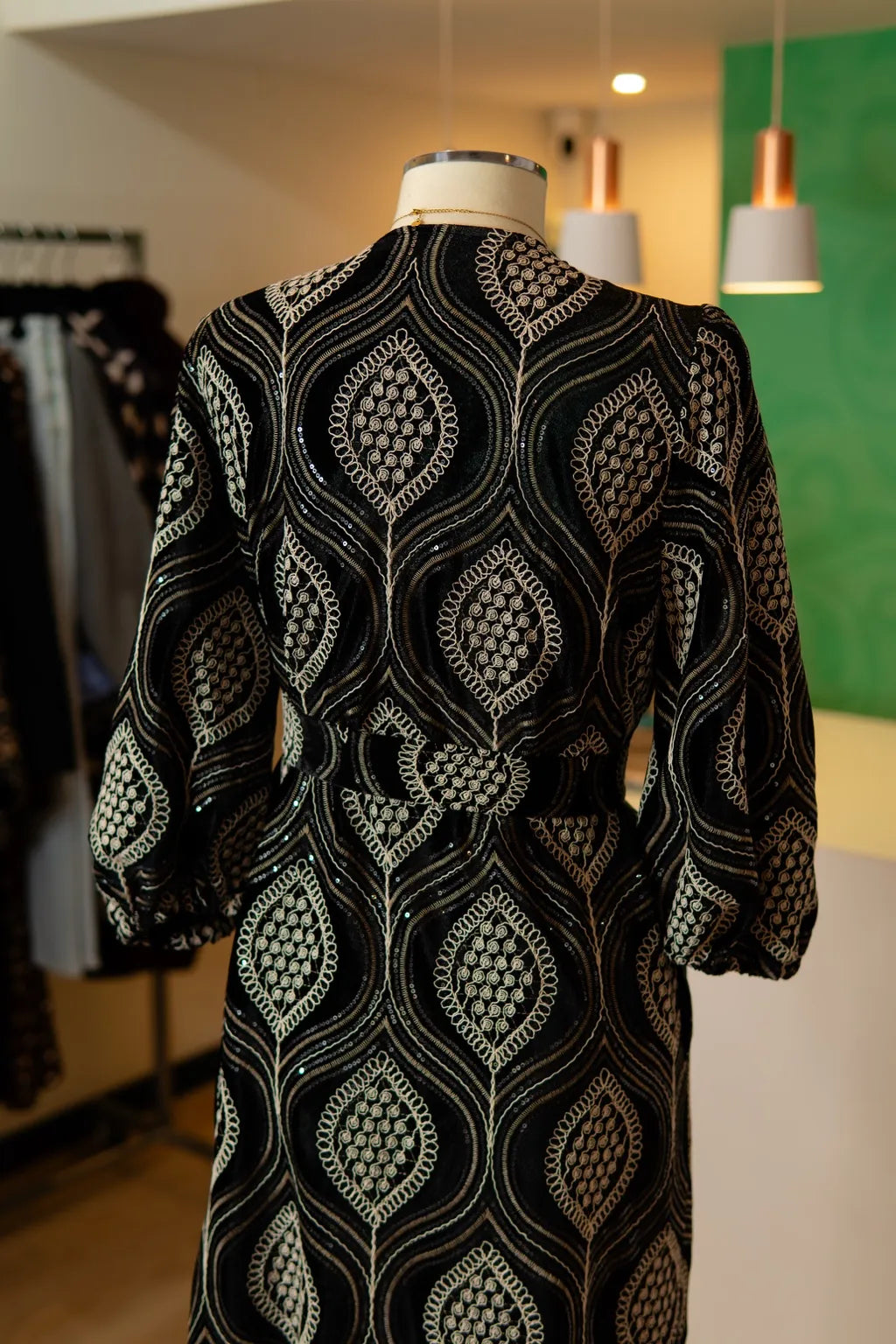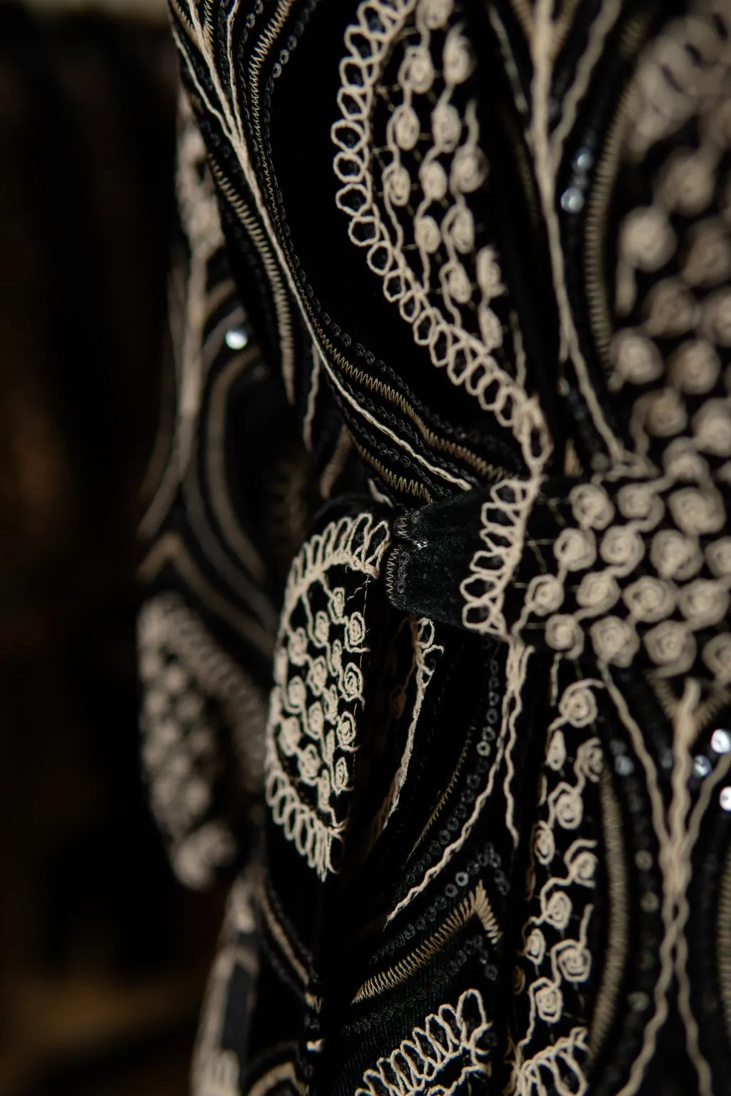 Trabalhado em veludo com alto relevo bordado em espiral, este vestido carrega uma estética ornamental que remete à arquitetura decorativa do Oriente Médio. Cada folha estilizada forma um mosaico têxtil, onde o fio metalizado dança com a luz, criando pontos de fuga visuais ao longo do corpo.