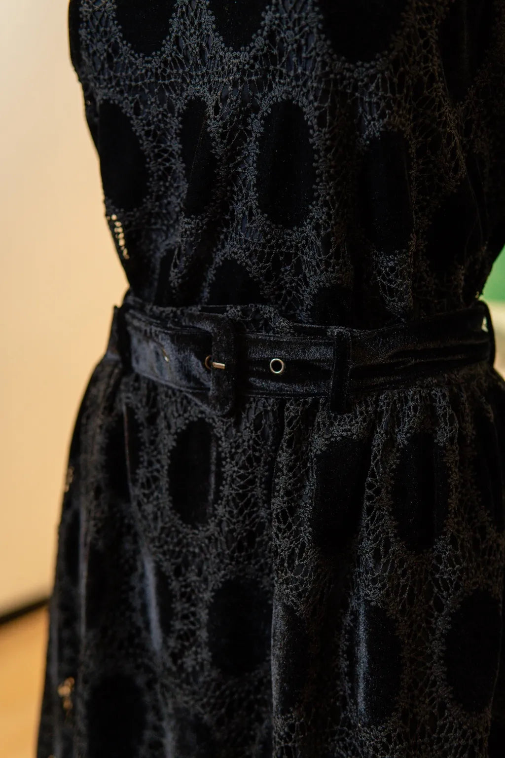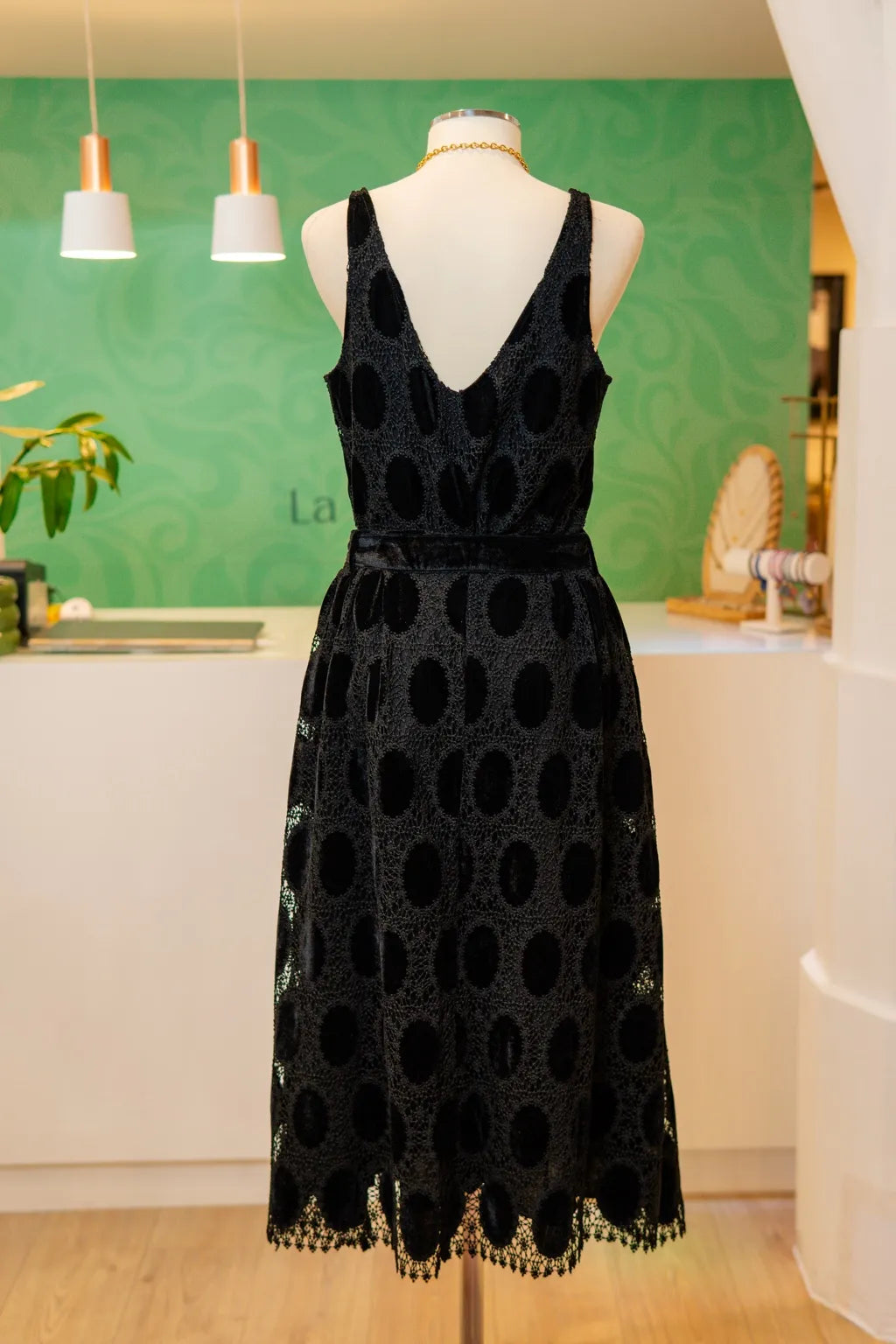Desenhado em uma renda encorpada com motivos ovais em veludo, esta saia abraça a pele com peso e imponência.