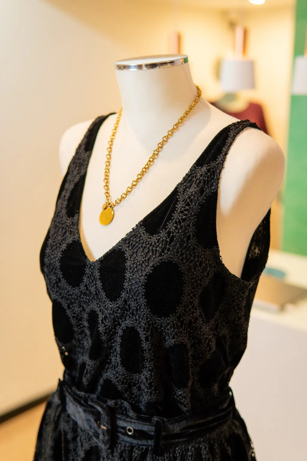 Profundidade e contraste em uma peça onde a arte têxtil encontra a silhueta feminina.
