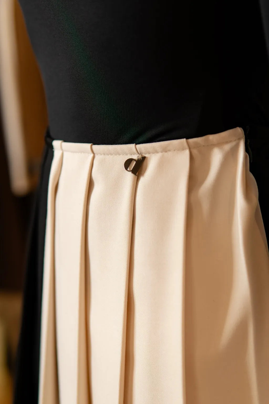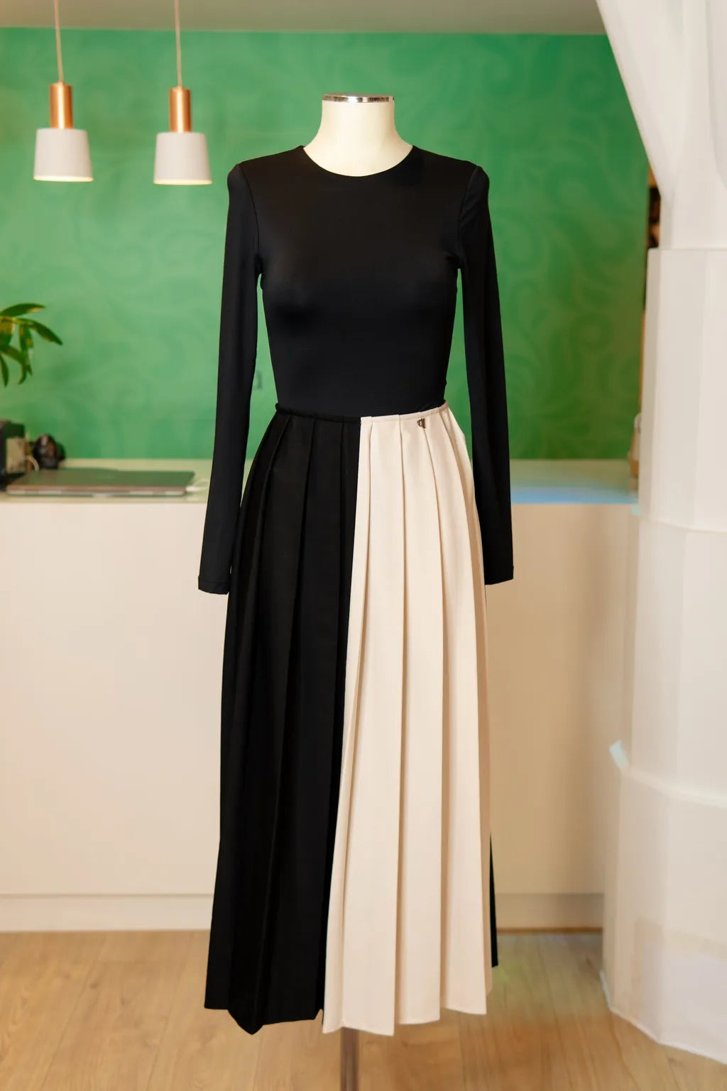 Na união entre o preto absoluto e o off-white opaco, a saia revela uma composição tensa e sofisticada, marcada por pregas fundas que criam ritmo e peso visual. O contraste vertical reforça uma silhueta elongada e controlada, com caimento firme e geometria limpa.