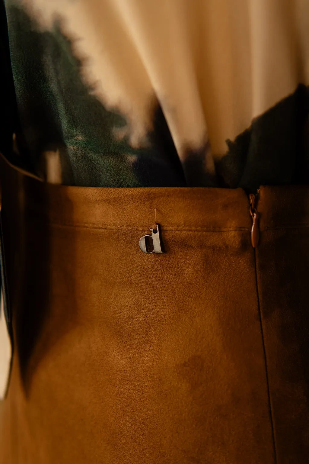 A camisola estampada com laço frontal traduz elegância artística em contraste com a estrutura limpa da saia em suede caramelo.