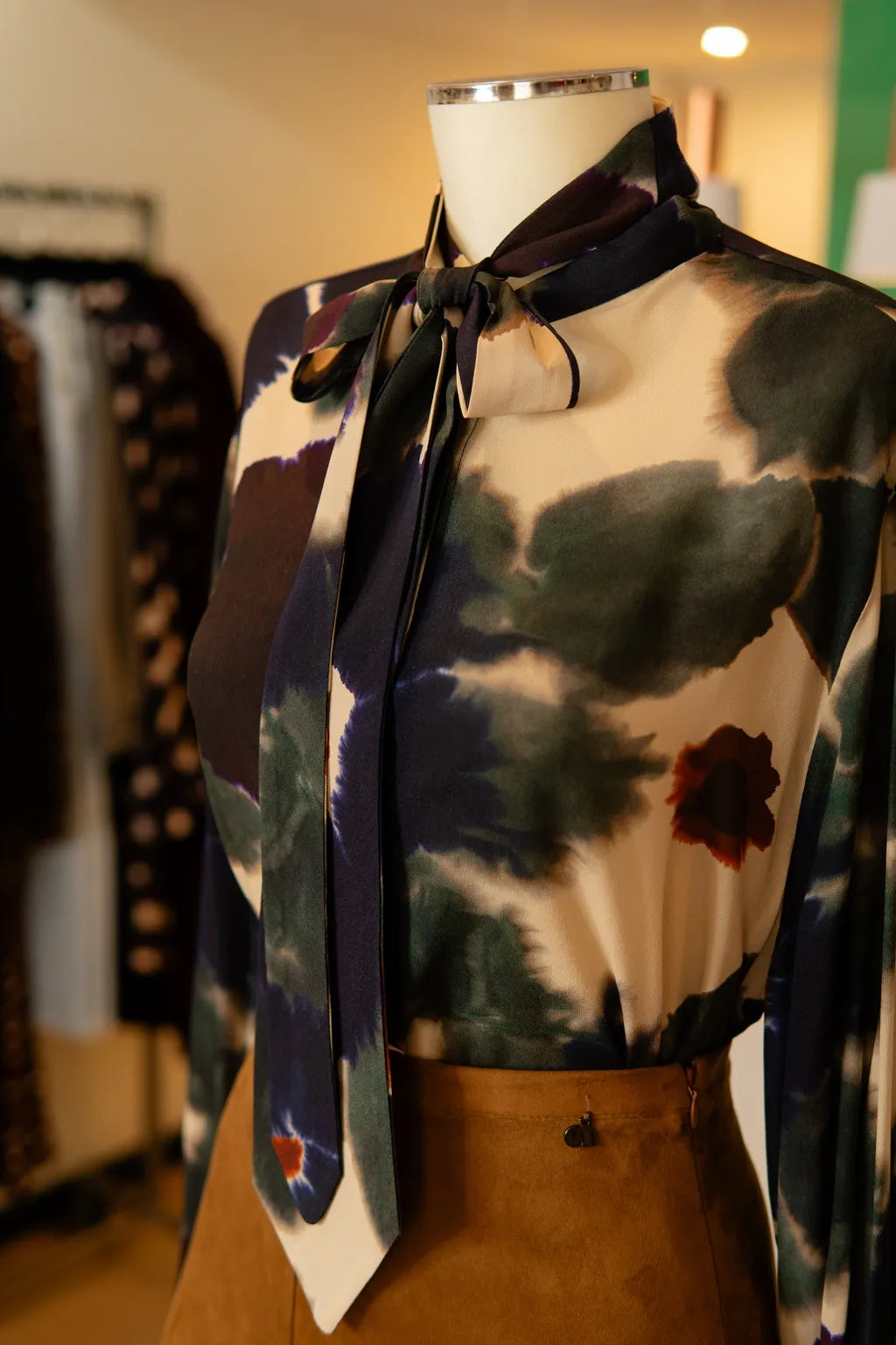 A blusa em crepe de seda estampado evoca pinceladas orgânicas com manchas de verde, púrpura e ferrugem sobre fundo cru, criando um efeito de aquarela abstrata. O laço frontal longo molda o pescoço com suavidade, rematando a gola alta com refinamento sutil.