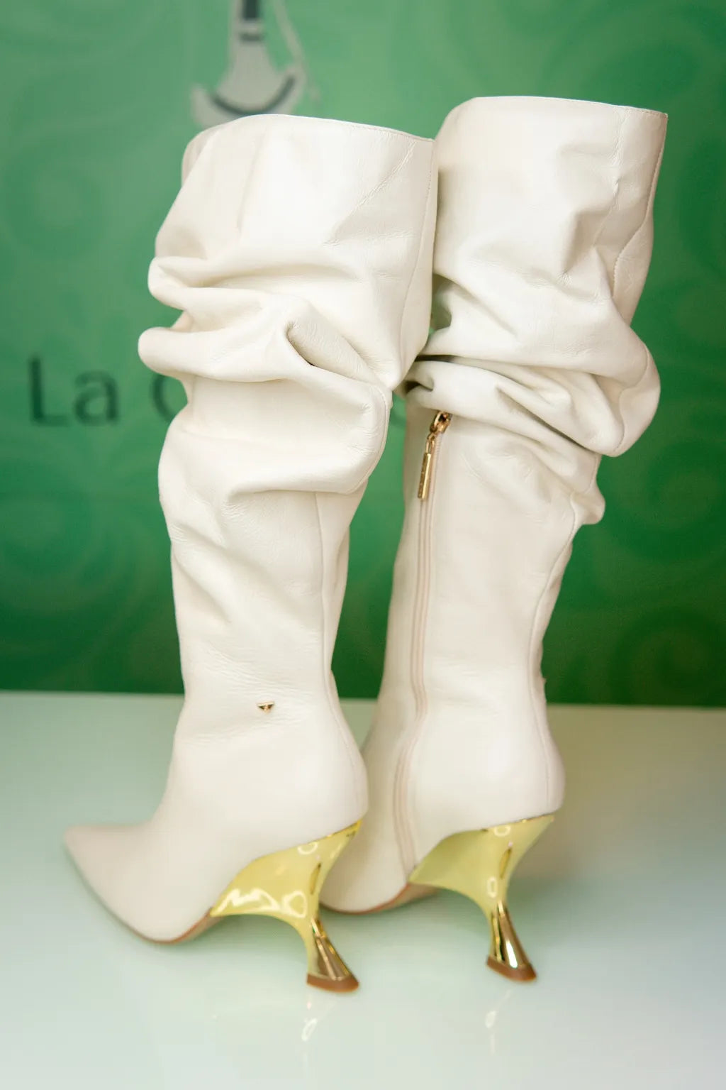 Estas botas, de traço irrepreensível e porte altivo, evocam a nobreza de um design que transcende modas passageiras. O couro suave, de textura impecável, molda-se em linhas fluidas que se unem ao dramatismo subtil do salto dourado — não apenas um suporte, mas um símbolo de distinção. O equilíbrio entre forma e função confere-lhes a ousadia necessária para marcar presença sem nunca ceder ao excesso.