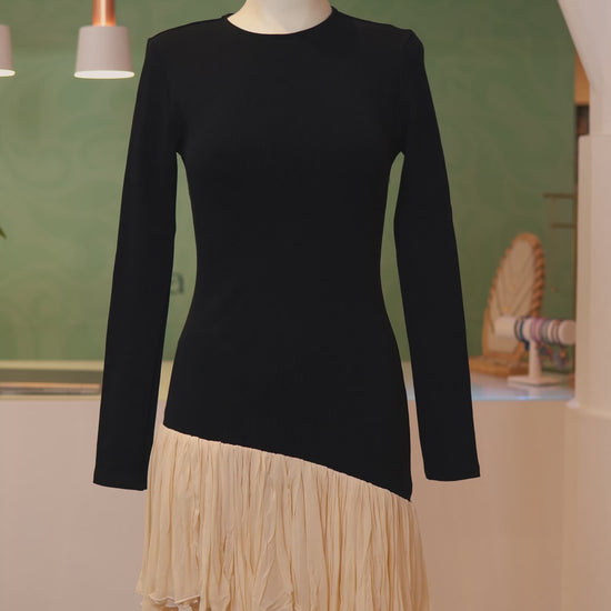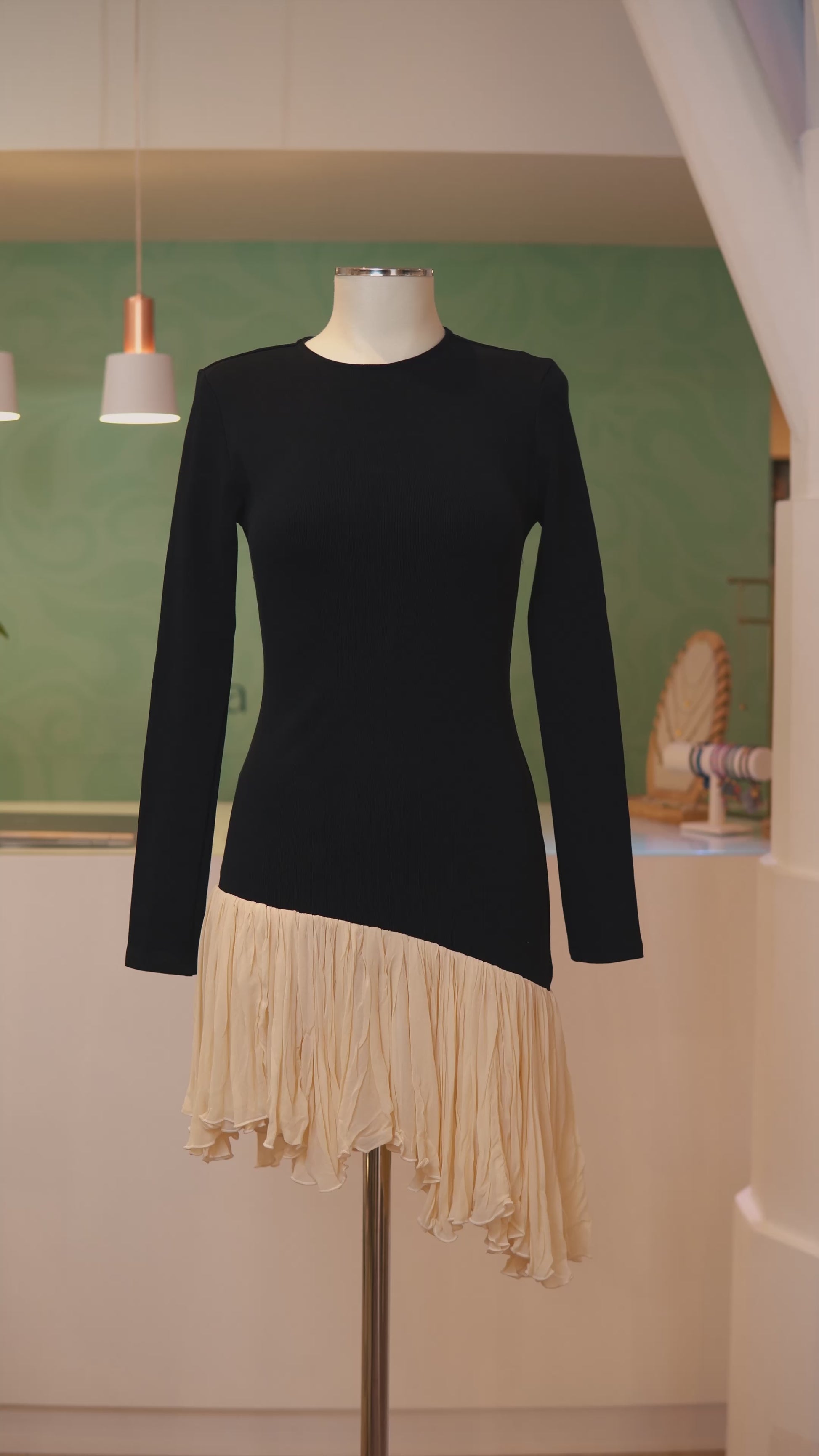 O vestido une corpo em malha encorpada preta a uma saia plissada em off-white, criando um diálogo tenso e sofisticado entre contenção e liberdade. A base ajustada modelo com precisão, enquanto o recorte diagonal desestabiliza e instiga o olhar.