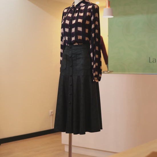 A padronagem gráfica da Melanzana redefine a camisa clássica com intensidade visual e caimento fluido. Uma peça que oscila entre o experimental e o atemporal.