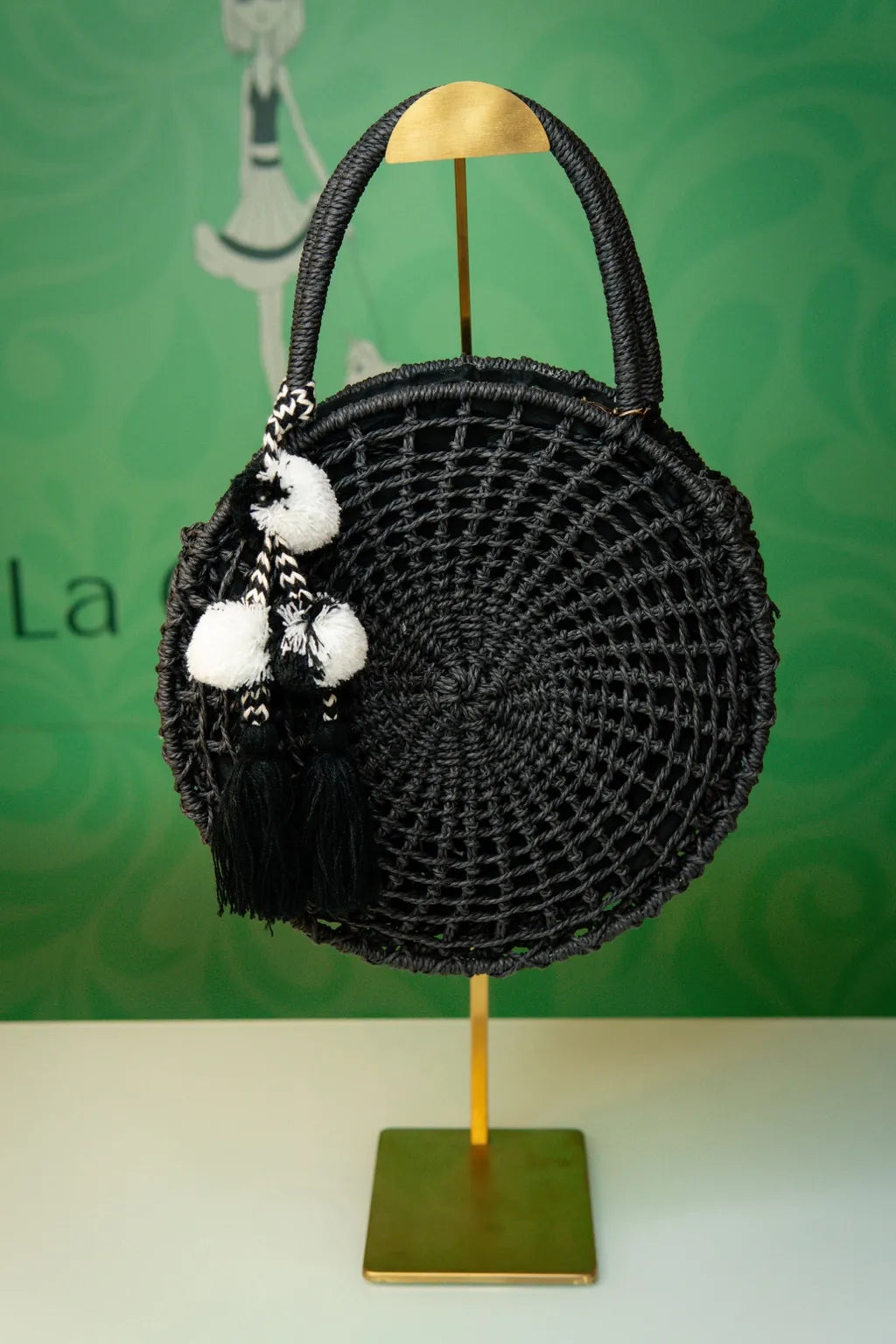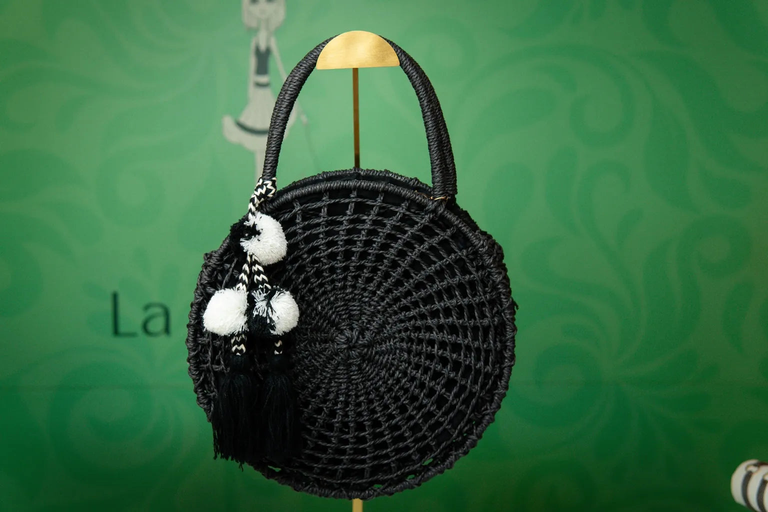 A sobriedade do negro, moldada em linhas circulares e rigorosamente entrelaçadas, encontra aqui a sua mais sublime expressão. Esta peça, simultaneamente ousada e discreta, revela uma harmonia rara entre a força do artesanato e a delicadeza do detalhe. O adorno em pompons bicolores acrescenta-lhe um carácter lúdico, quebrando a austeridade da forma com um gesto subtil de irreverência