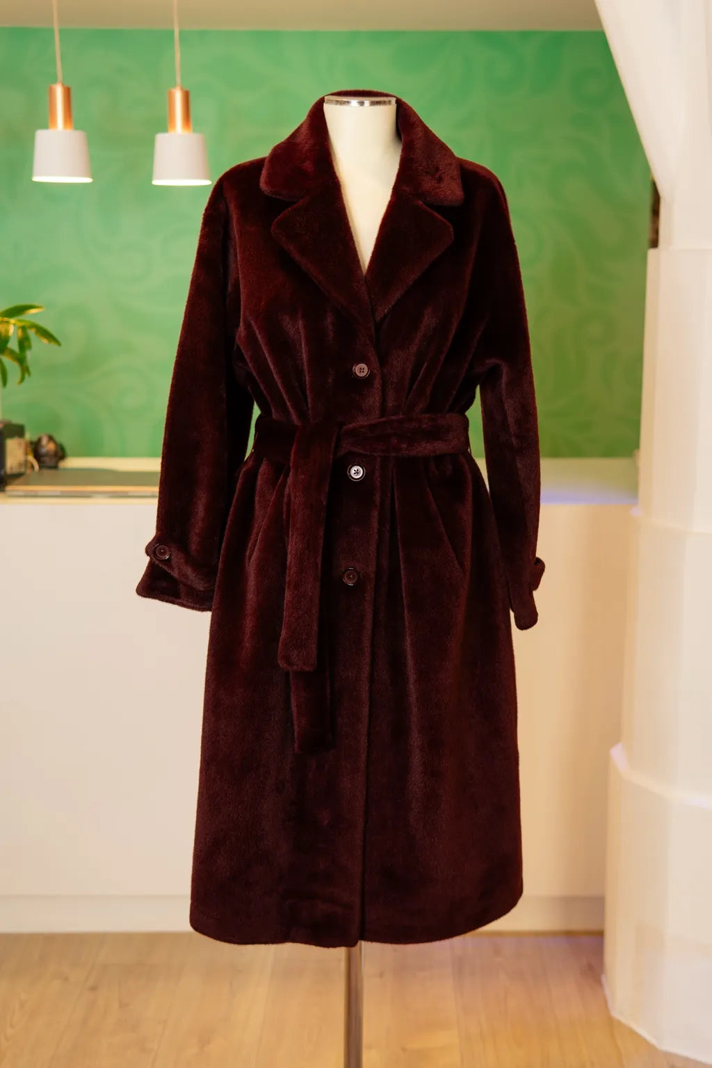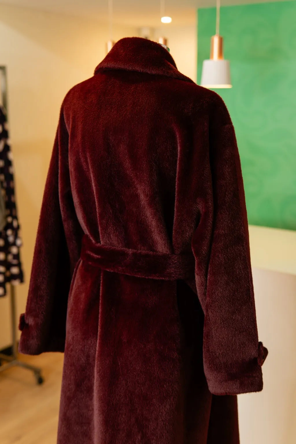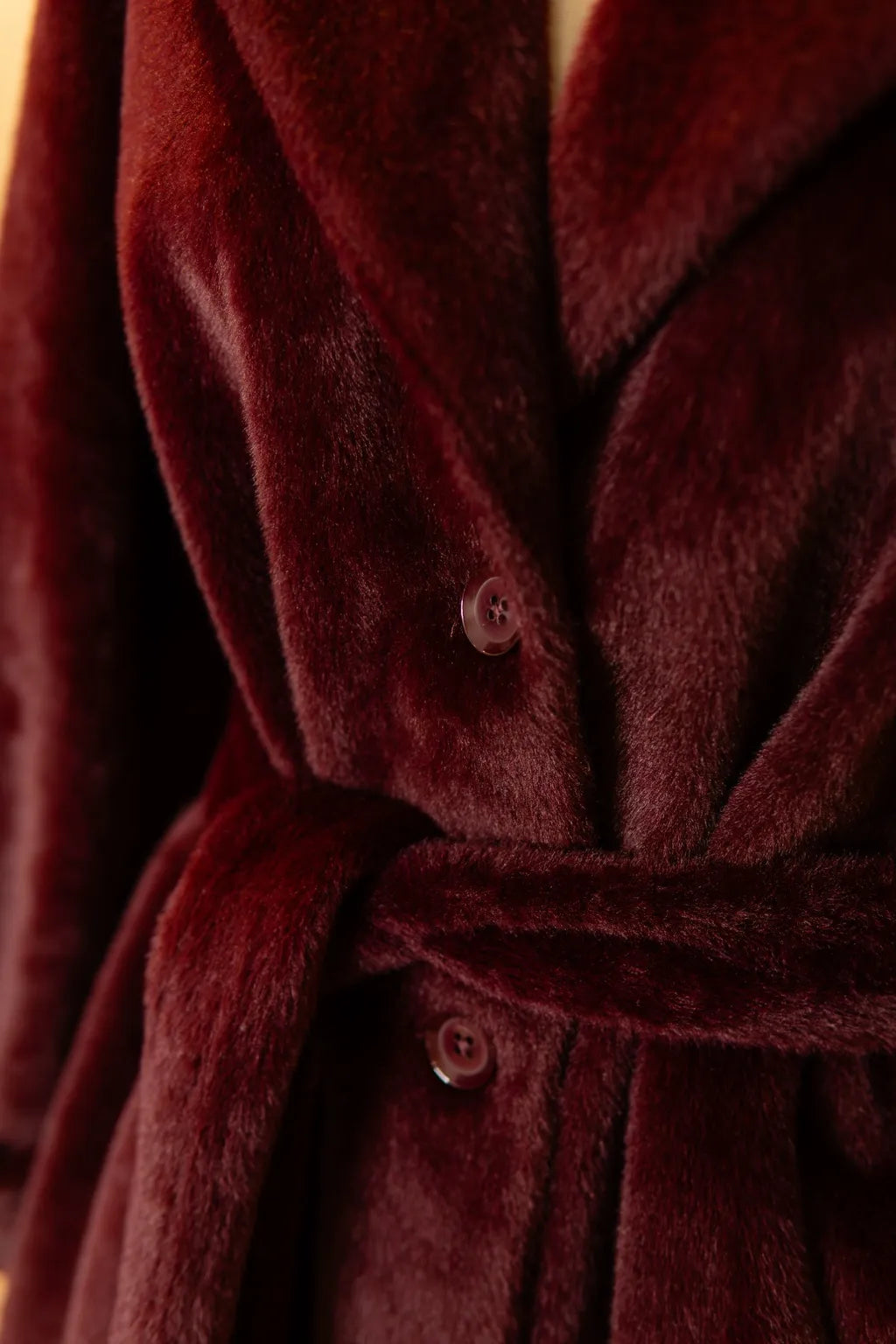 A superfície aveludada em tom vinho escuro projeta densidade cromática e uma tridimensionalidade quase líquida, refletindo a luz em gradações de carmim profundo. O toque denso do pelo sintético de fibra fechada sugere um isolamento térmico de excelência, evocando peso visual e físico com firmeza escultural.