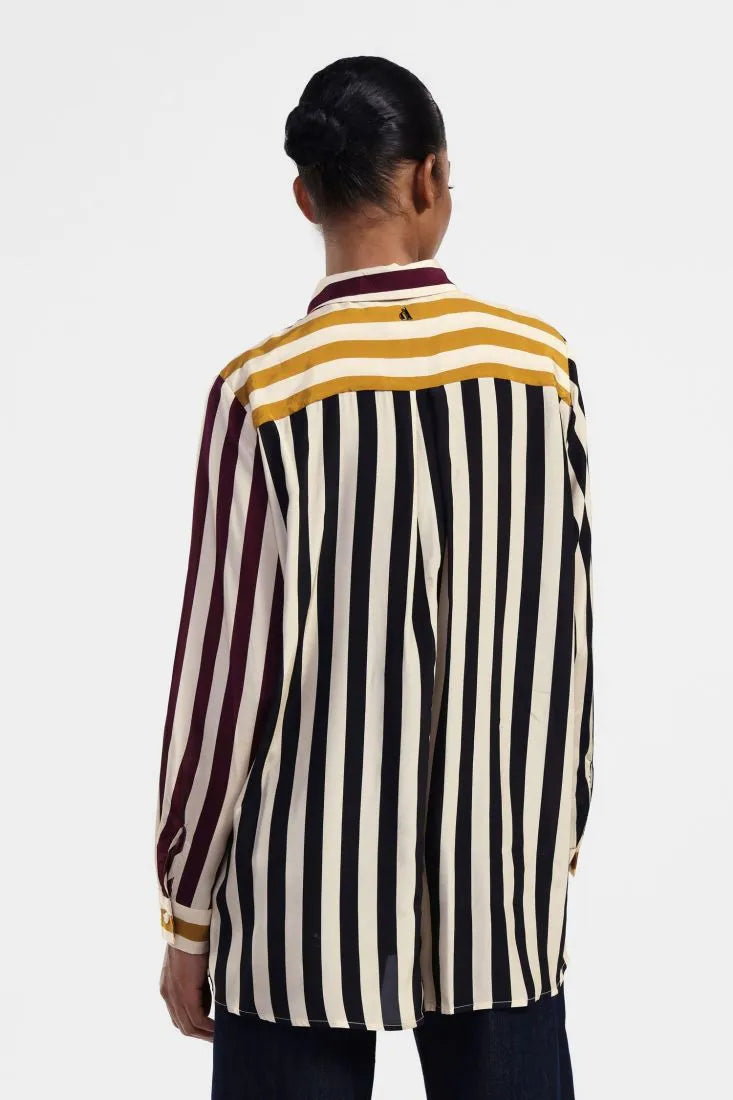 Camisa de manga comprida em seda leve, com padrão listrado assimétrico em tons de vinho, mostarda e azul-escuro sobre base marfim. A gola clássica com laço preto confere estrutura, enquanto o bolso frontal em contraste reforça a linguagem gráfica da peça.
