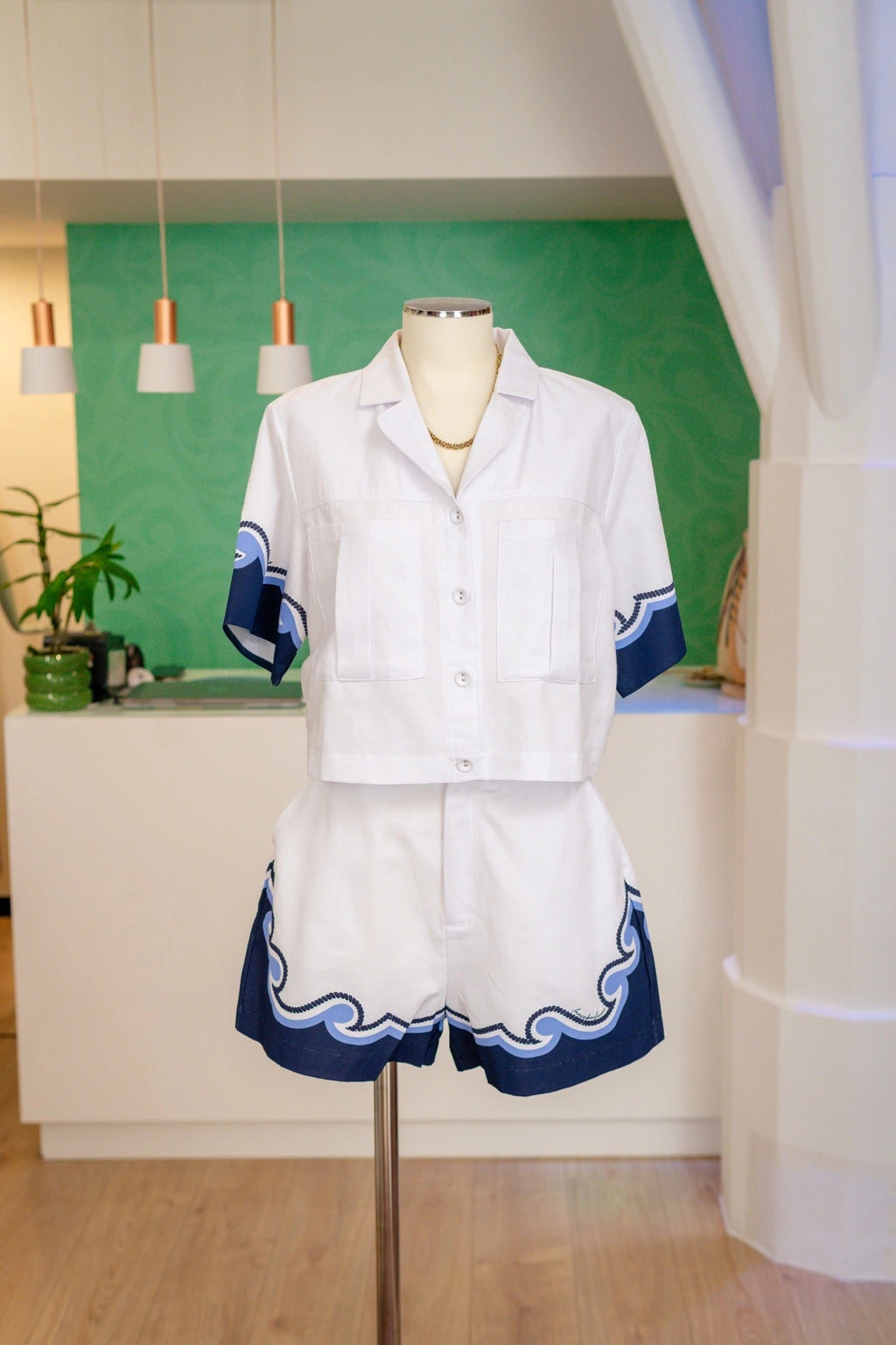 Em plena harmonia, os calções de cintura média apresentam o mesmo motivo decorativo ao longo da bainha, conferindo uma continuidade visual de rara sofisticação. A estrutura do tecido, de textura leve e respirável, garante conforto absoluto, mesmo nos dias mais soalheiros.