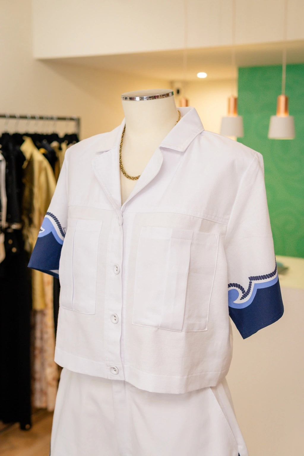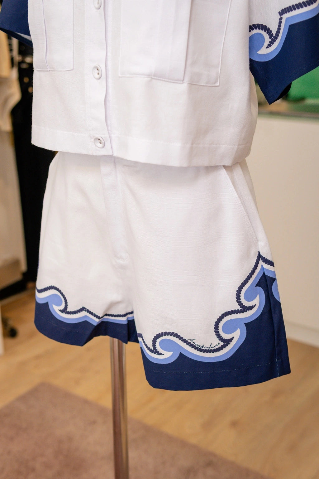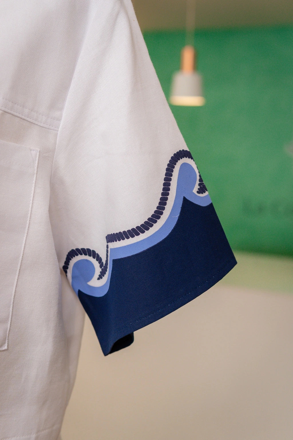A camisa de corte rectilíneo, com colarinho clássico e fecho por botões frontais, é realçada por bolsos amplos que oferecem funcionalidade sem sacrificar o requinte. Os punhos curtos recebem uma estampa ondulada em tons de azul-marinho e azul-céu, evocando o movimento das marés com uma sobriedade gráfica digna de nota.