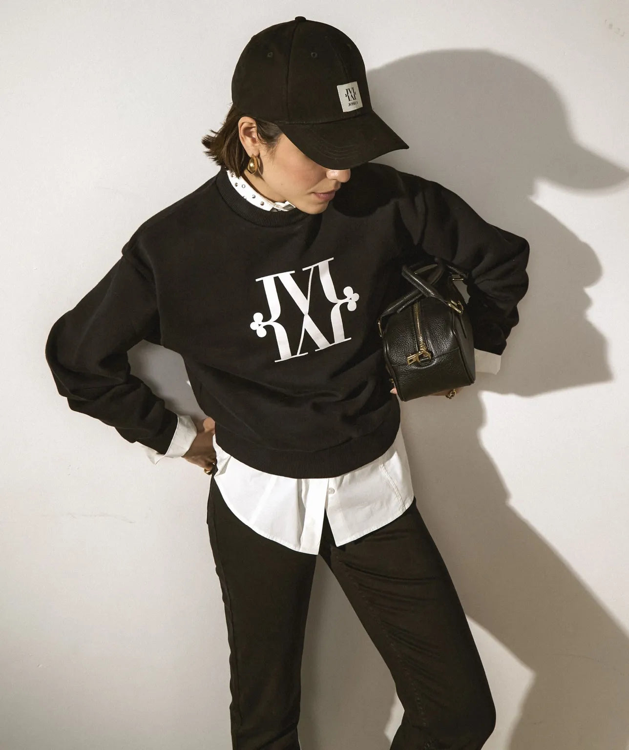 Uma sweatshirt minimalista que se impõe com presença e assinatura emblemática