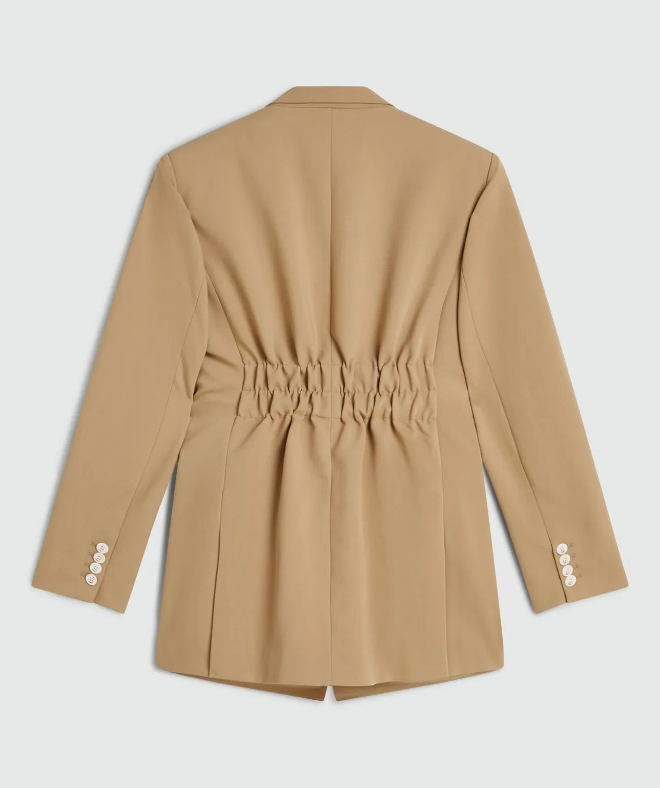A Estrella veste o poder com elegância e precisão: modelagem estruturada, botões sofisticados e cintura marcada por elástico drapeado que valoriza a silhueta. A proposta mistura o rigor da alfaiataria com o frescor da feminilidade contemporânea, criando um visual ousado e impecável