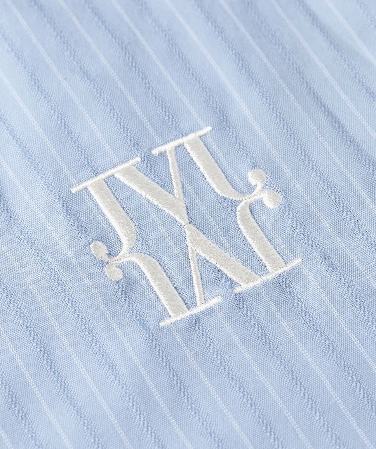A camisa Hedy apresenta corte amplo com caimento estruturado, gola alta e laço opcional para styling versátil. O tecido em algodão maquinetado com riscas finas garante textura sofisticada e visual polido.