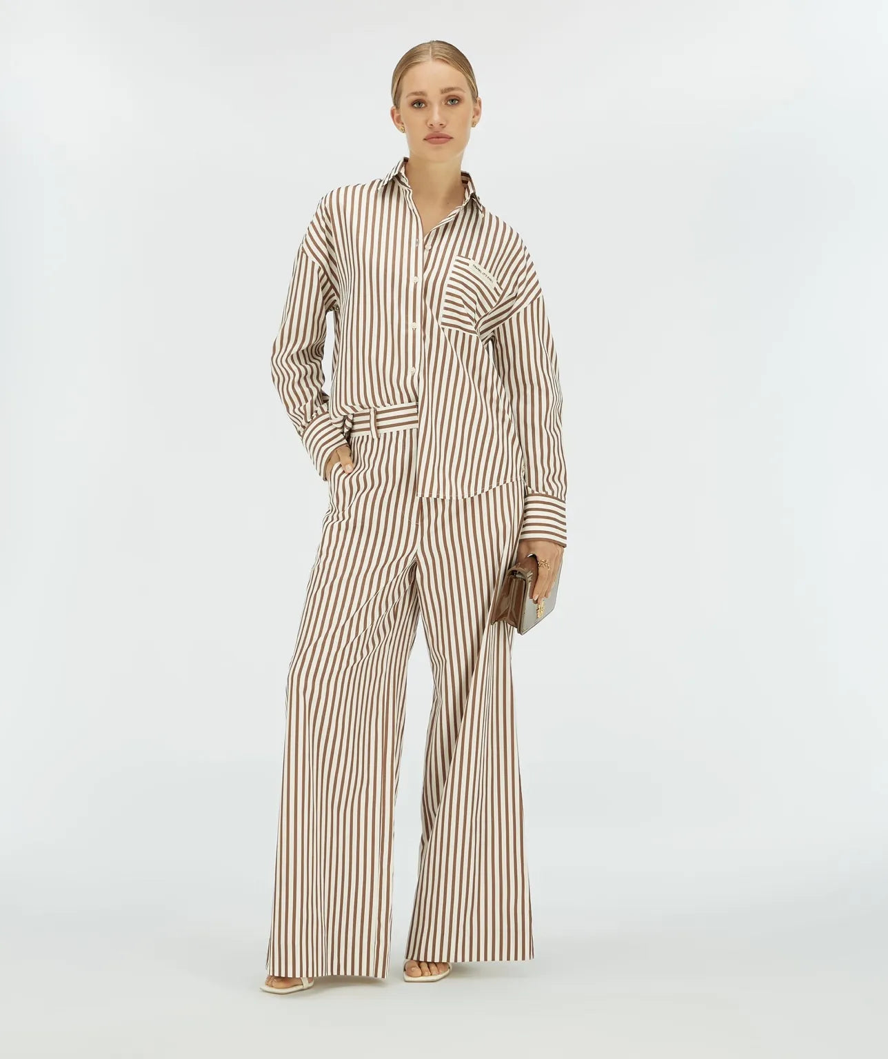 A camisa Lexx, em tons subtis de castanho chocolate e écru claro, surge como um tributo à elegância meticulosa e ao rigor do bom gosto. As riscas verticais, alinhadas com perfeição milimétrica, prolongam visualmente a silhueta, enquanto o corte clássico confere estrutura e leveza simultaneamente. É a reinvenção da camisa listrada, pensada para a mulher contemporânea que preza cada detalhe.