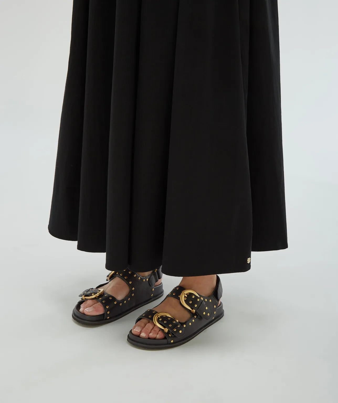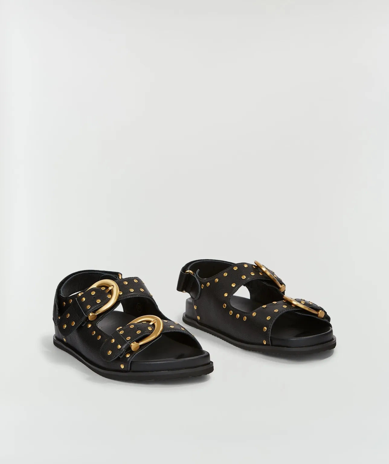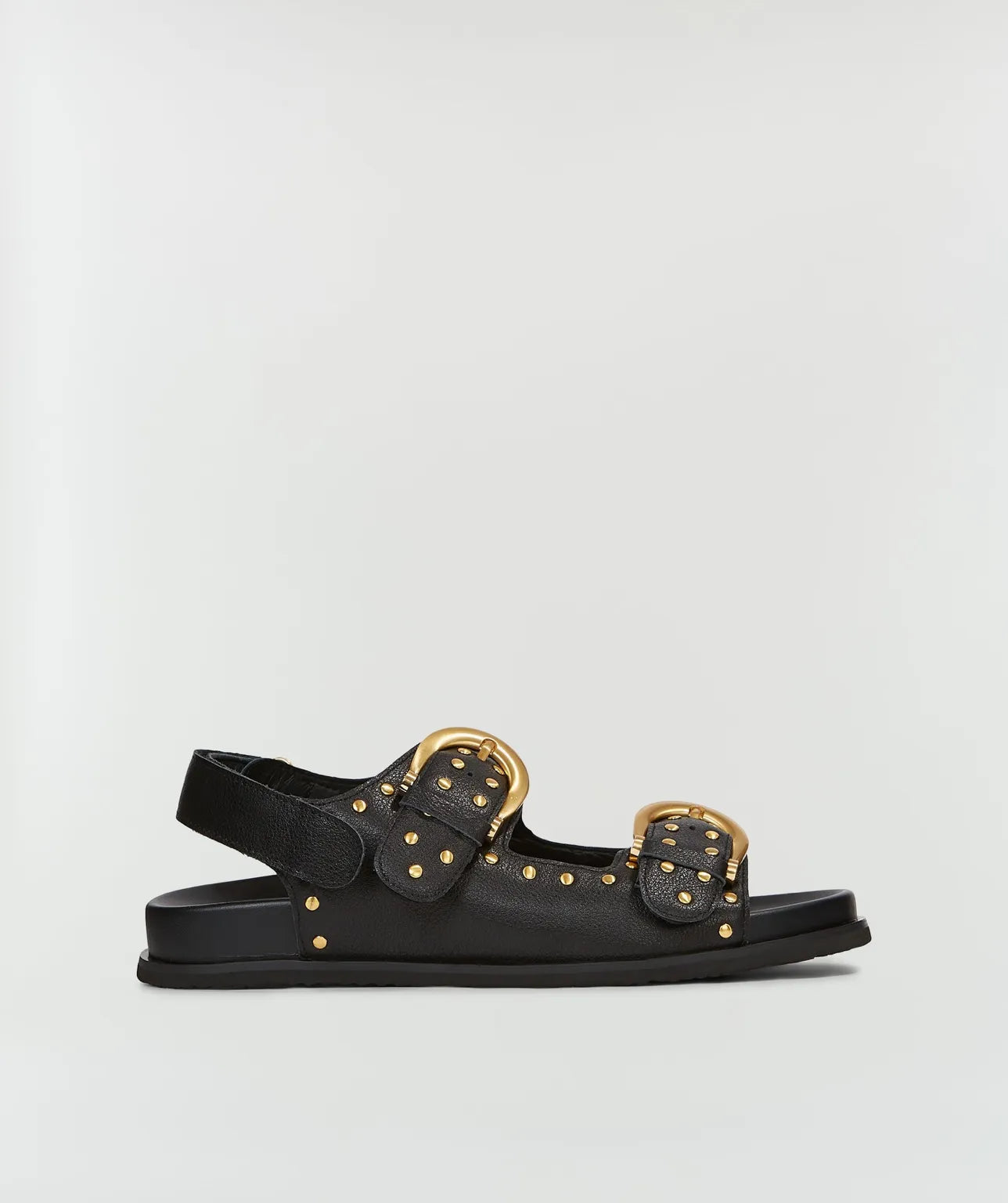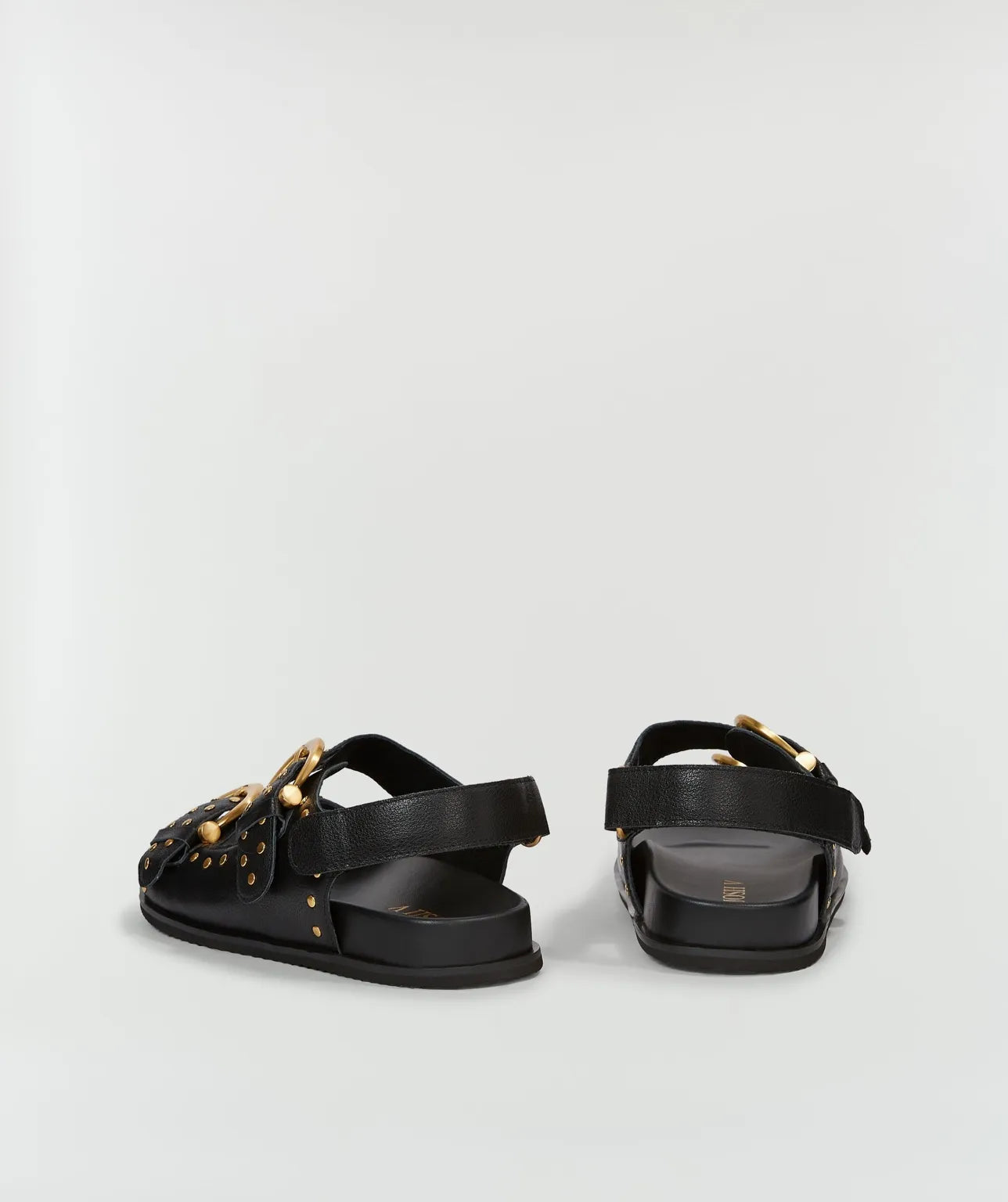 No epicentro entre sofisticação e conforto absoluto, nasce a sandália Maartje na sua versão em pele preta. Confeccionada com materiais de excelência e adornada com tachas metálicas douradas, esta peça é uma homenagem ao requinte funcional. A fusão entre a couro texturizada e os acabamentos dourados cria uma presença visual imponente, sem nunca ultrapassar os limites da discrição.