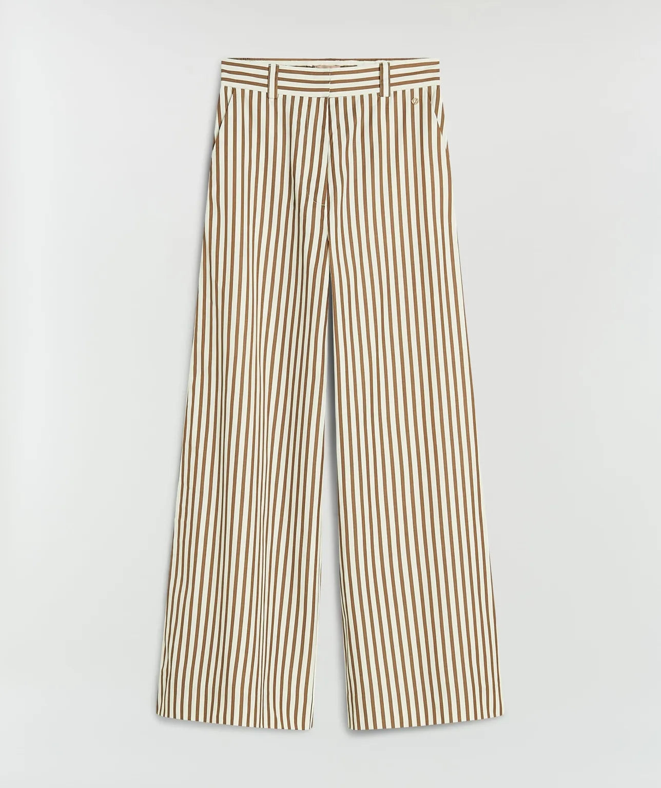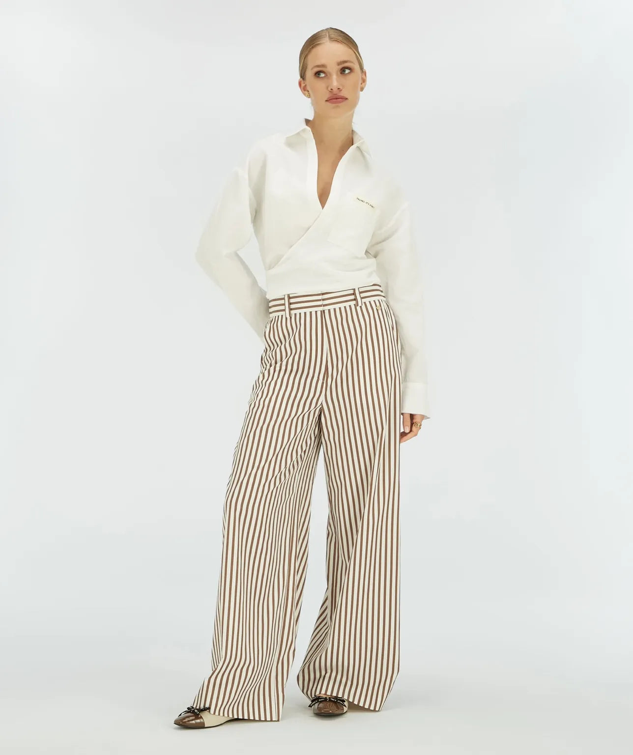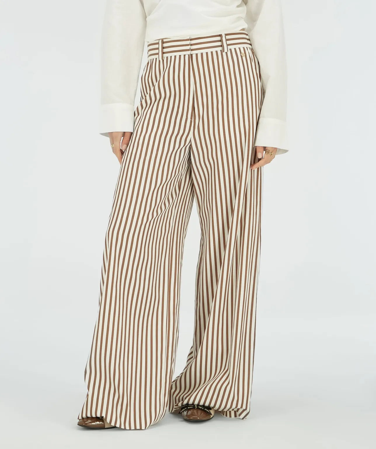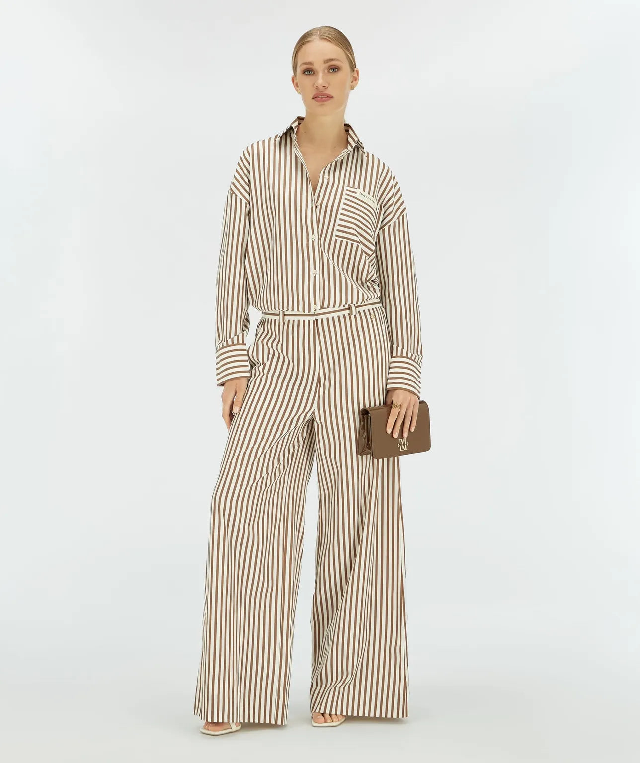 Calças Largas em Riscas Verticais Chocolate & Cru – Elegância Contemporânea