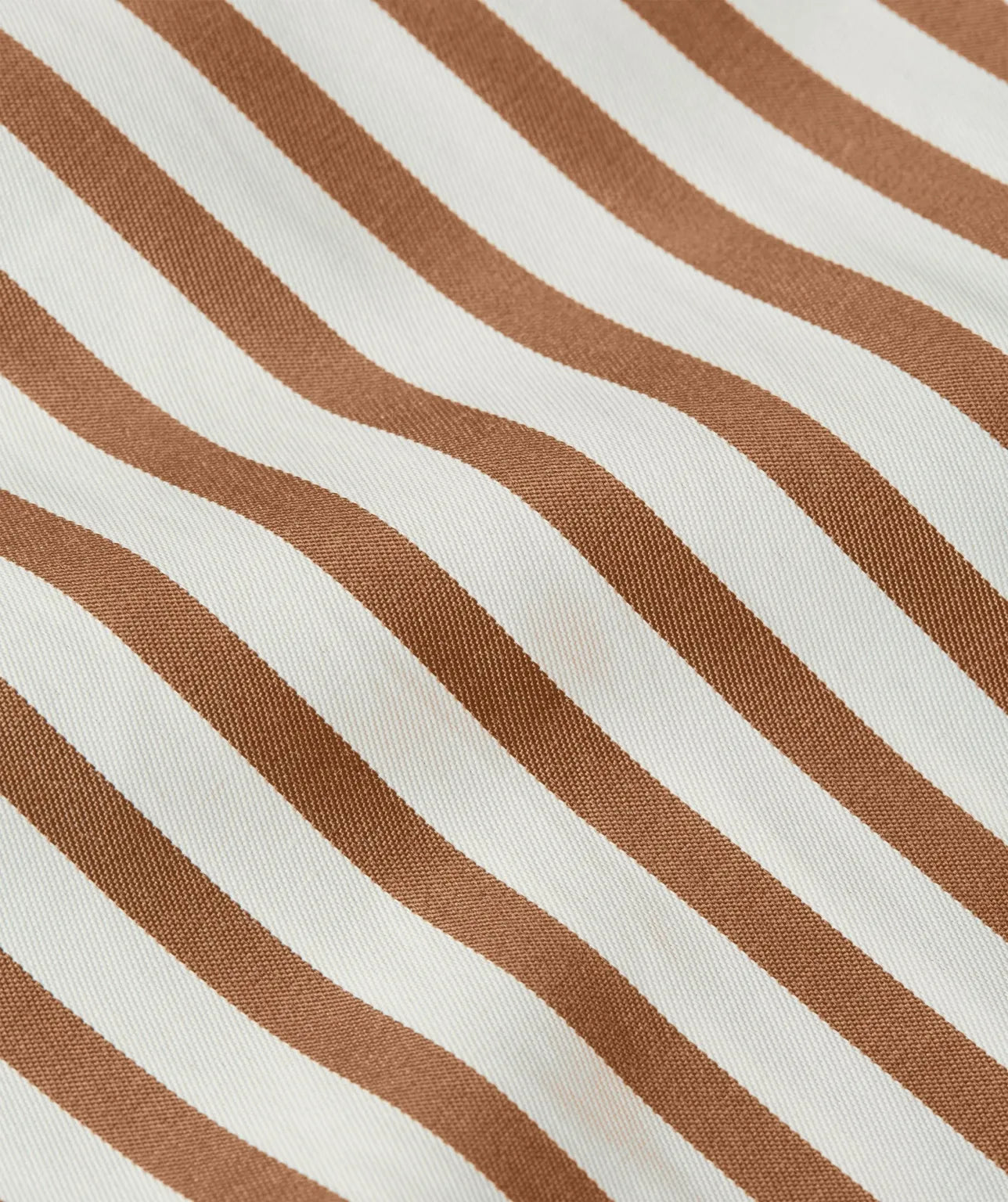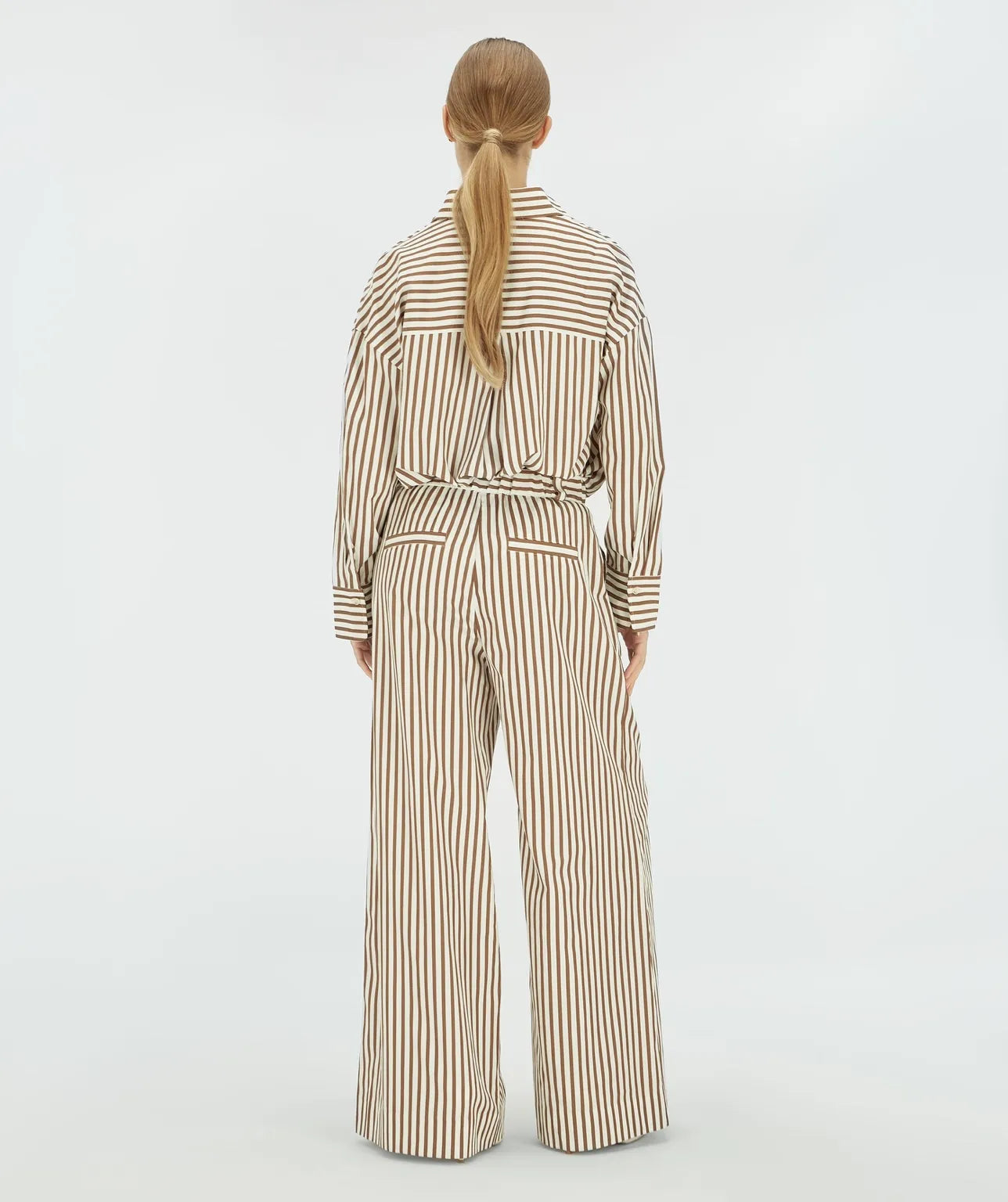Num equilíbrio entre tradição e modernidade, estas calças de corte largo apresentam-se como um manifesto de elegância intemporal. Confeccionadas com precisão artesanal a partir de um tecido de alta qualidade, a peça distingue-se pelo seu padrão de riscas verticais em tons de chocolate e cru, que conferem uma estética refinada e simultaneamente ousada. A escolha cromática remete subtilmente à sofisticação dos guarda-roupas clássicos, reinterpretada para o contexto contemporâneo com uma abordagem minimalista e decididamente cosmopolita.