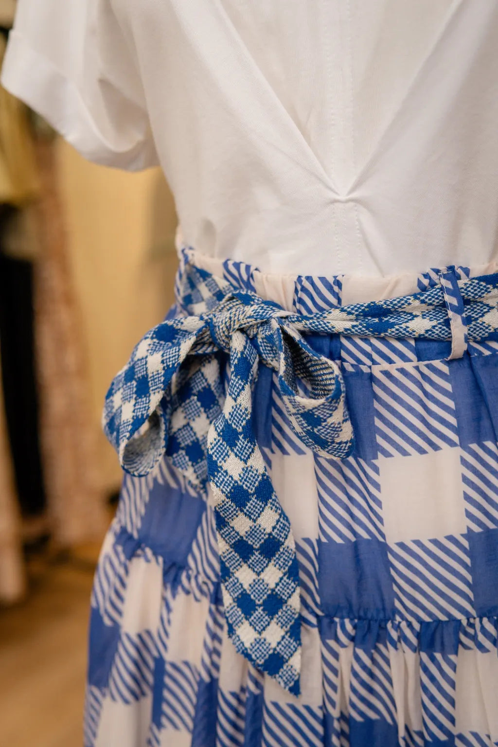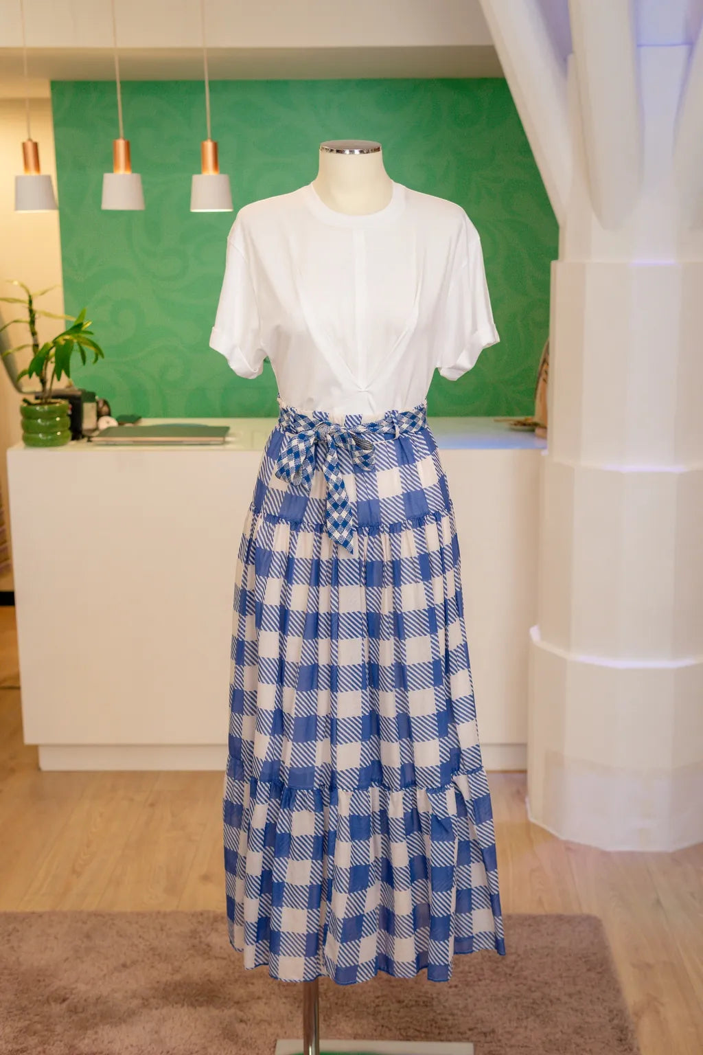 Apresentamos uma peça de vestuário que transcende as convenções da moda contemporânea: uma saia longa de silhueta fluida, concebida em tecido de algodão leve, adornada por um padrão xadrez em azul cobalto e branco marfim que evoca, simultaneamente, a tradição têxtil artesanal e a frescura dos dias soalheiros.