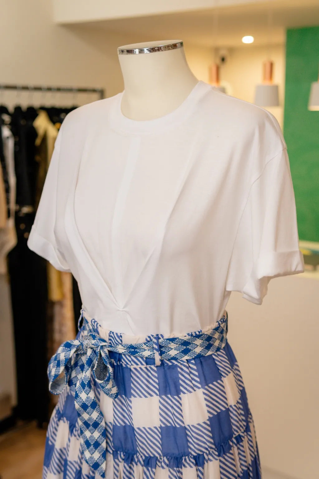 A cintura é elegantemente vincada por uma faixa em tecido coordenado, rematada por um laço decorativo que acrescenta subtileza e feminilidade ao conjunto. A estrutura em camadas da saia confere-lhe volume controlado e um movimento gracioso ao caminhar, enquanto a combinação cromática promove um visual simultaneamente sofisticado e descontraído.