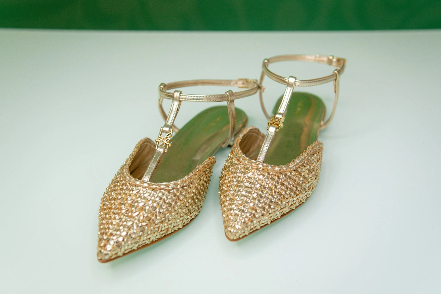 Estes sapatos representam a fusão perfeita entre a delicadeza artesanal e a imponência estética. O acabamento dourado, com o seu entrelaçado de luz e sombra, confere uma dimensão quase escultórica, concebida para realçar a presença de quem os calça.