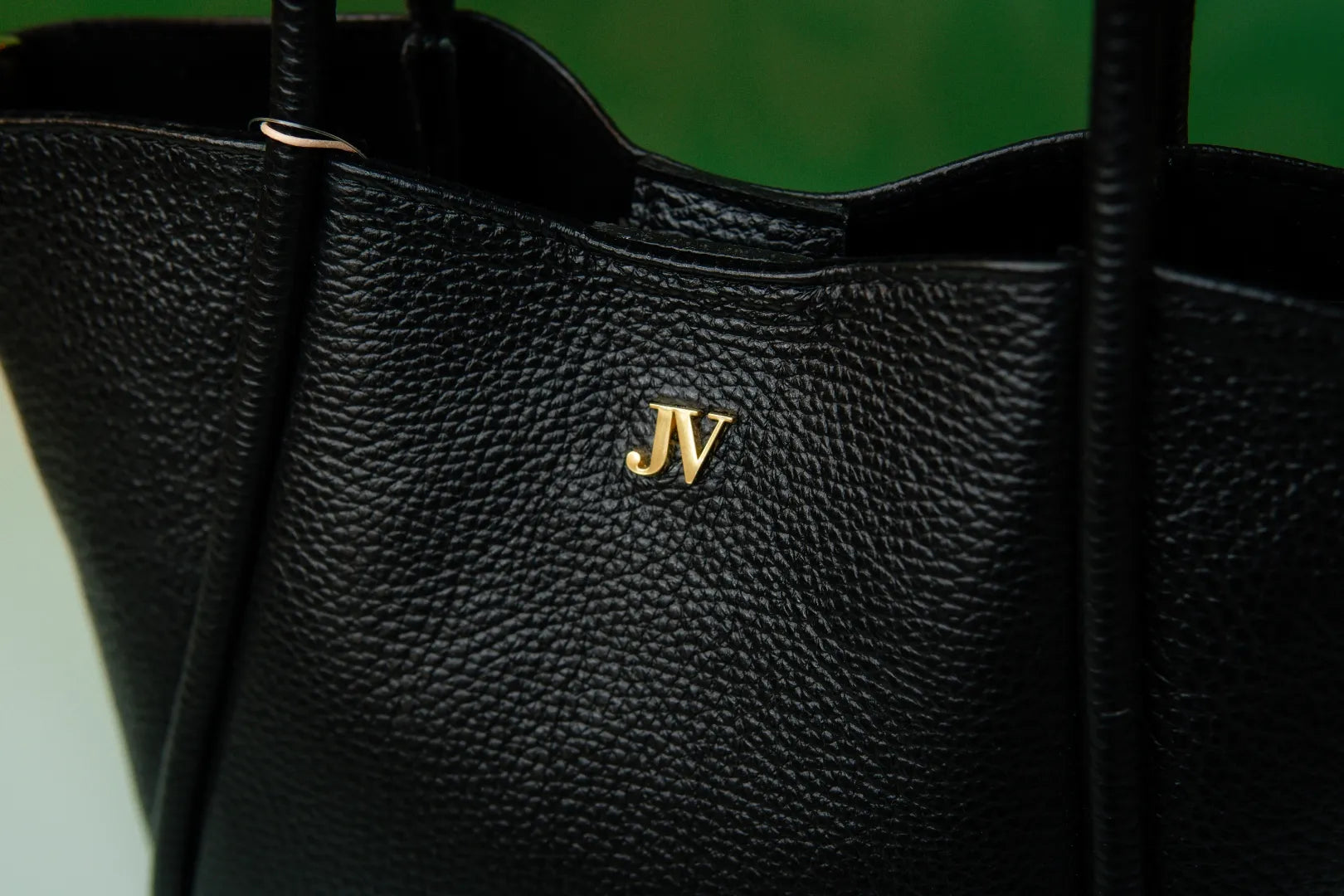 Esta peça, esculpida em pele preta de qualidade superior, evidencia uma busca apurada pelo requinte e essência intemporal. O detalhe das iniciais JV em dourado, subtil mas imponente, grava nesta criação um selo de exclusividade e distinção reservada a espíritos de gosto irrepreensível. O desenho contido, de linhas depuradas, convoca uma sofisticação tranquila, resgatando a elegância discreta e o respeito pela decoração.