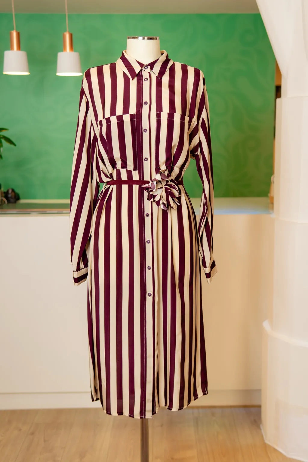 A sequência de listras verticais vinho profundo e areia quente cria um efeito visual de alongamento, conferindo imponência ao corpo sem esforço. A modelagem reta com amarração floral na cintura sugere um movimento arquitetado, entre o controle e a fluidez.