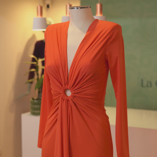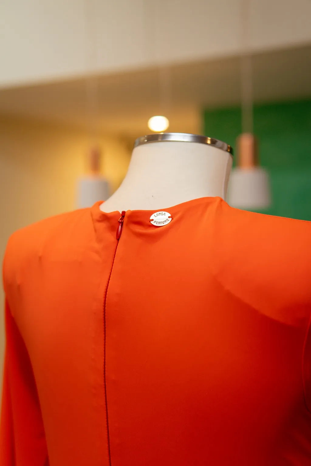 O tecido acetinado em laranja vibrante captura luz e movimento com vigor cinético, enquanto a fenda central em cascata projeta fluidez arquitetônica. Fecho invisível nas costas e caimento anatômico completam a peça com sofisticação escultural.