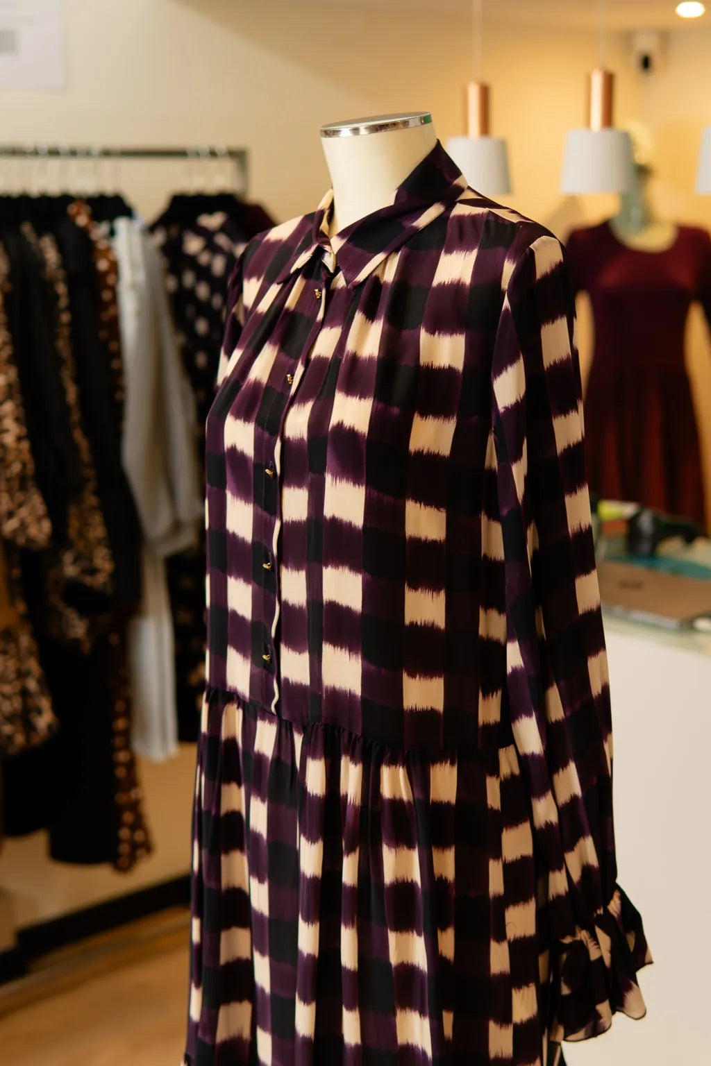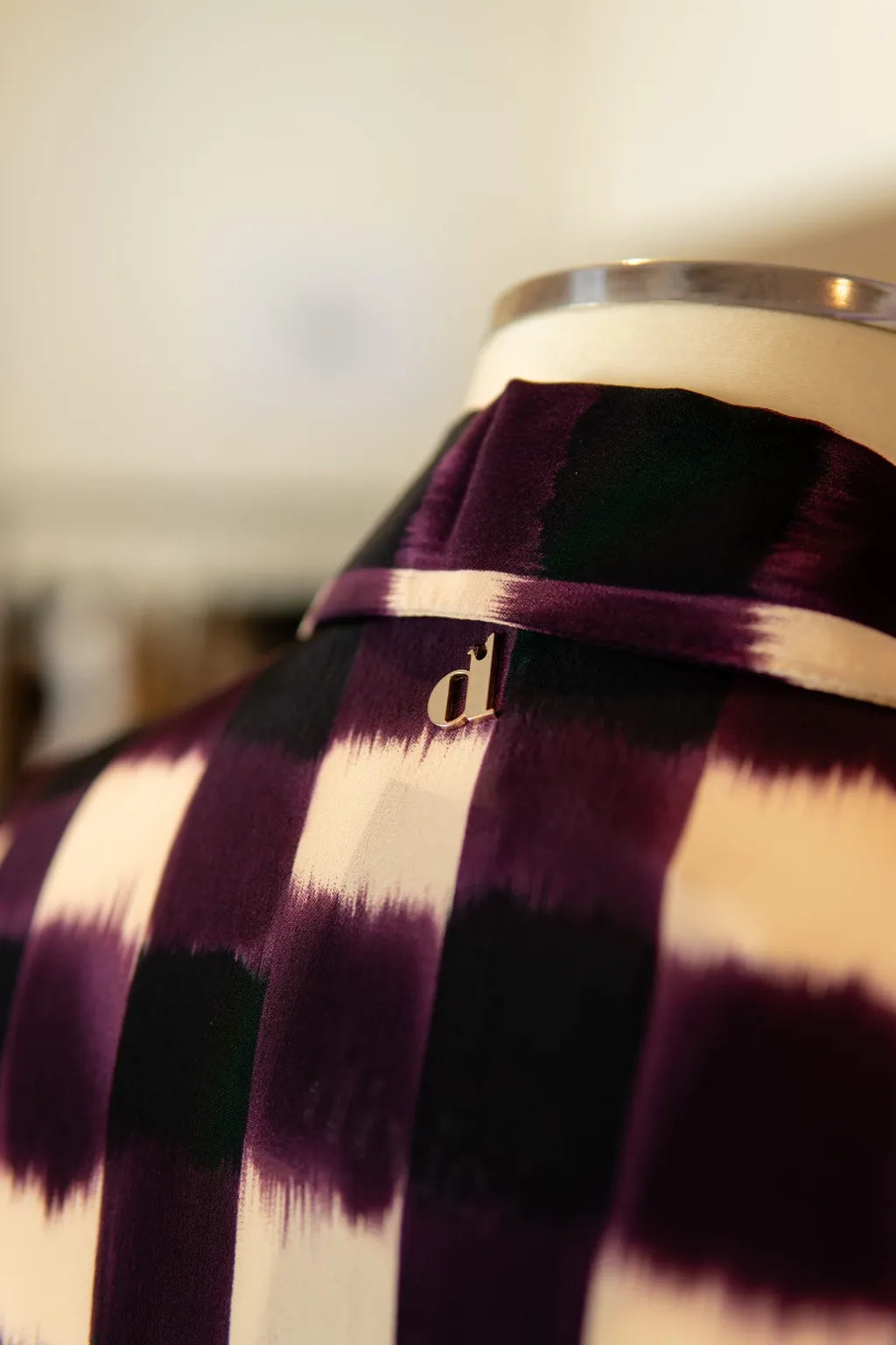A peça ganha vida com o contraste entre o roxo profundo, marfim e preto, em estampa que mescla rigor geométrico com leveza visual. O tecido acetinado reflete luz sutilmente, destacando o caimento suave e o volume da saia com babados.