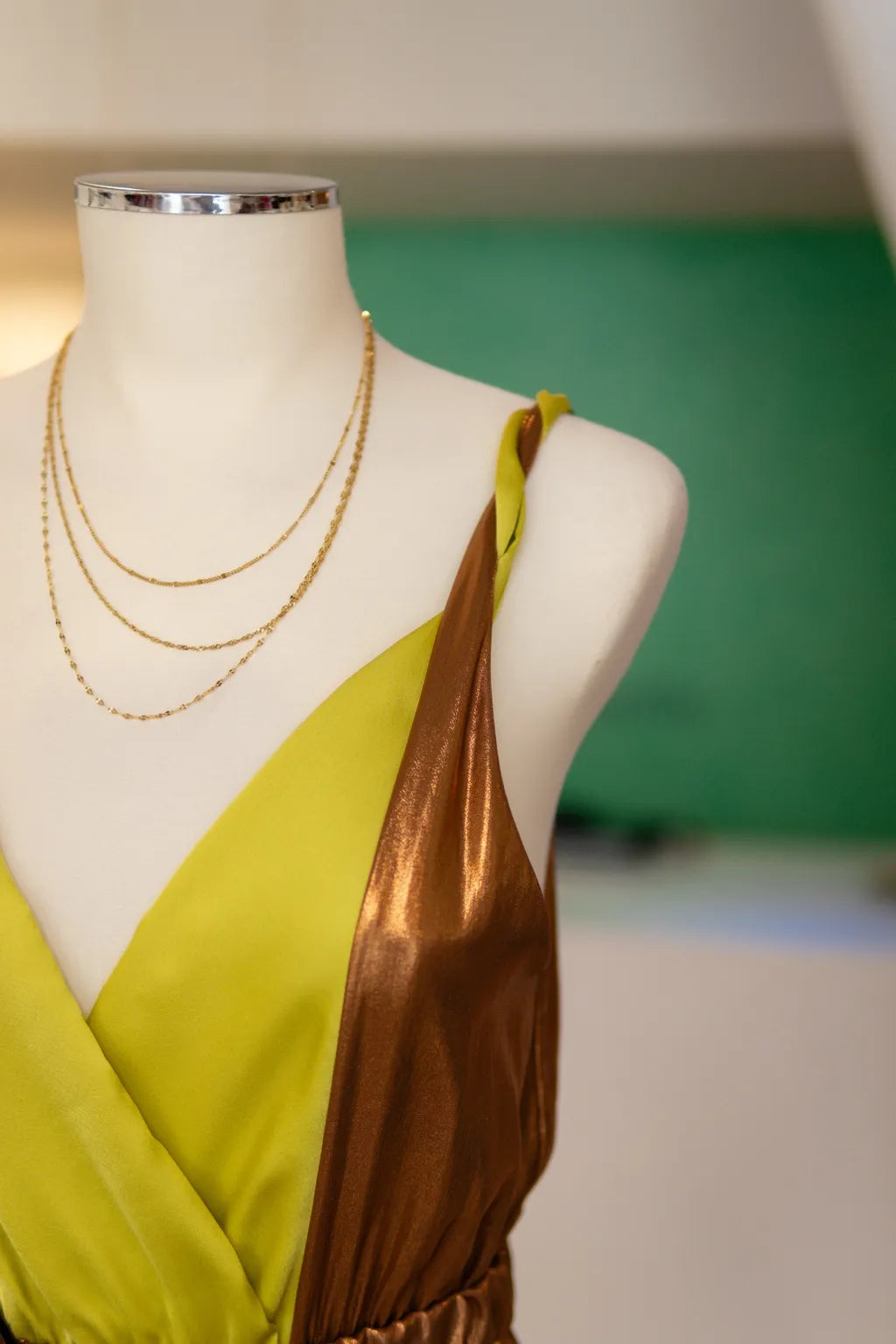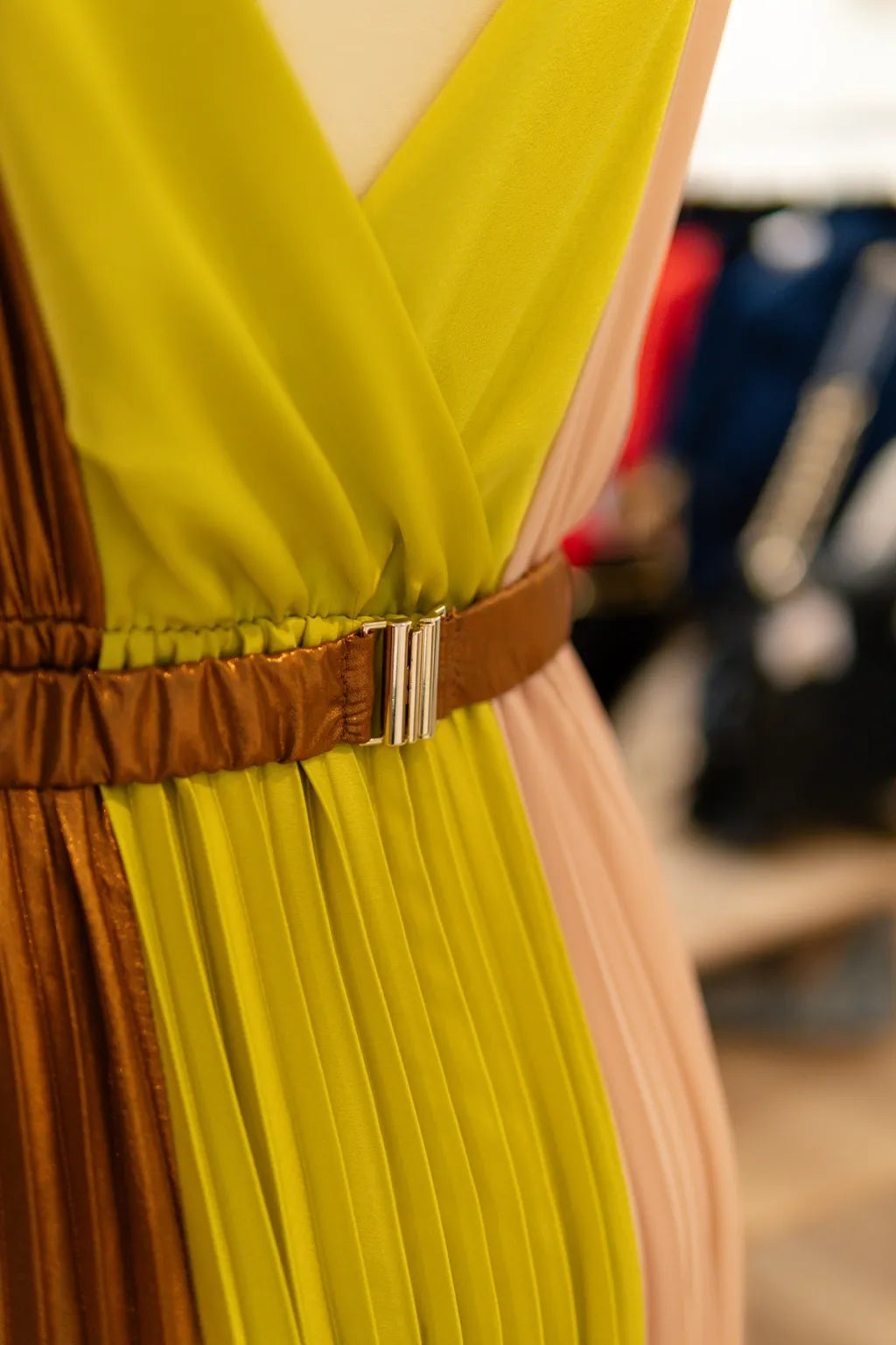 A composição cromática, composta por tonalidades de rosa pálido, verde-lima e cobre metálico, é meticulosamente equilibrada, proporcionando um efeito visual impactante e simultaneamente gracioso. Um dos elementos mais distintivos da peça é o cinto acetinado que acompanha o vestido, adornado por uma flor escultórica cuidadosamente plissada, que remete à delicadeza artesanal da alta-costura.